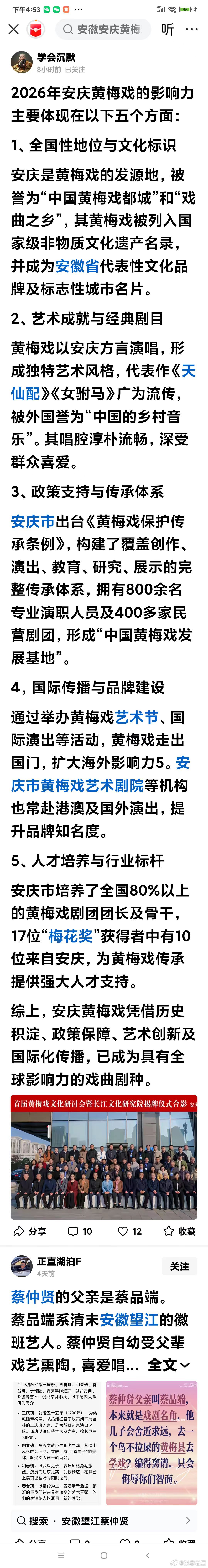 喜讯:安徽省打造文化品牌战略规划,黄梅戏跻身“五大文化”之列——重视并加强安徽“五大文化”的研究和宣传是安徽文化工作者的责任与担当(1800字)◎老屋张忠编辑现就几部中文工具书的表述作一研究探讨,它们说“湖北是黄梅戏起源地”,这类表述看起来“没毛病”,深读起来,再反复地细细思考,你就会发现,这种表述有个“叙事不完全”缺陷:1.“湖北是黄梅戏起源地”这句话不完整,“源头”在哪里没有交代。2.它们“只主张”,却“未举证”。笔者就此将这句话补充完整:黄梅戏的一支亲缘剧种是皖、鄂、赣三省交界处的采茶戏。“湖北是黄梅戏起源地,源头在安庆。”那么,我为什么说“湖北是黄梅戏起源地,源头在安庆”呢?我主张,我举证。黄梅戏的远源源流有“民歌灯会傩戏”,源头是安庆地区汉乐府民歌《孔雀东南飞》。后世将其故事演绎搬上黄梅戏演艺舞台。黄梅戏的中源源流有“歌舞祭祀百伎”,源头是安庆地区的五月之望“张百戏”——元代安庆府亲民官余阙碑记。黄梅戏的近源源流有“剧本、音乐唱腔、方言道白、班社、表演程式”,源头是清乾隆间(1780年代)“石牌腔”。石牌腔及其剧本举证于乾隆年代的朝廷文献(军机处转发乾隆皇帝谕旨、以及安徽巡抚、江苏巡抚、云南巡抚等上报奏折)。清季到民国时期,安庆地区有怀腔-府调-皖剧,新中国时期的1952年至1953年,安徽诞生黄梅戏剧种。结论:“湖北是黄梅戏起源地,源头在安庆!”喜讯:安徽省打造文化品牌战略规划,黄梅戏跻身“五大文化”之列——重视并加强安徽“五大文化”的研究和宣传是安徽文化工作者的责任与担当(1800字)◎东流老街;老屋张忠编辑/2026年1月8日晚