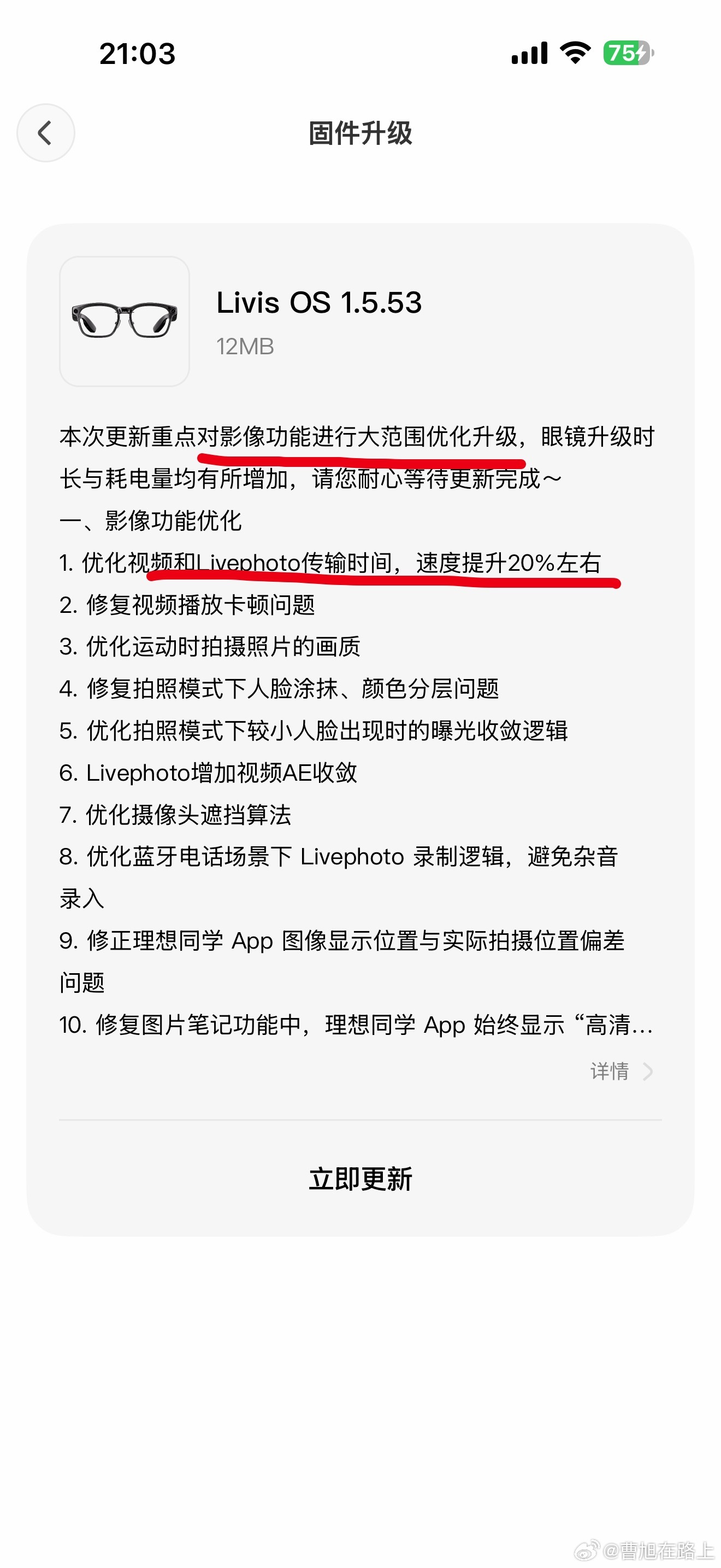 理想智能眼镜Livis这次迎来升级红线上面画了小重点特别提升了视频从眼镜传输进aoo速度肉眼可见的升级速度据说livis在咸鱼上已经加价了这个眼镜确实很轻便好用等继续小长测的报告理想ai眼镜livis