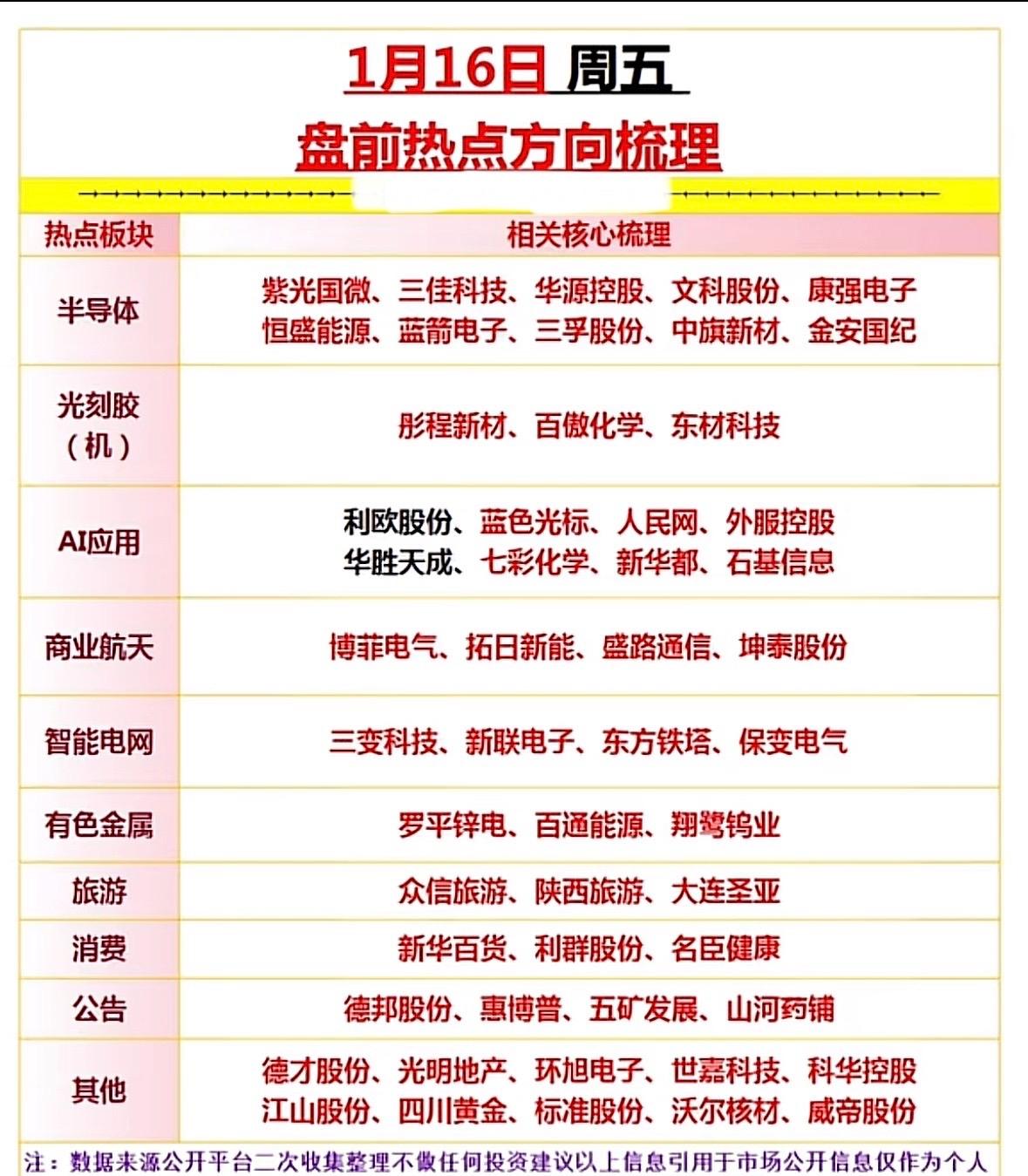 1月16日盘前热点方向梳理,把握市场动态! 周五盘前热点:半导体、光刻胶领涨,AI应用、商业航天活跃,智能电网、有色、旅游消费轮动,多股公告引关注。 "半导体光刻胶领涨,AI应用商业航天活跃,智能电网有色旅游消费轮动,关注公开市场热点板块动向"