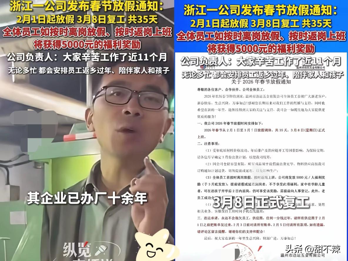 怪不得这家公司能发财!浙江温州,一公司春节放35天!公司负责人:按时返岗还白送