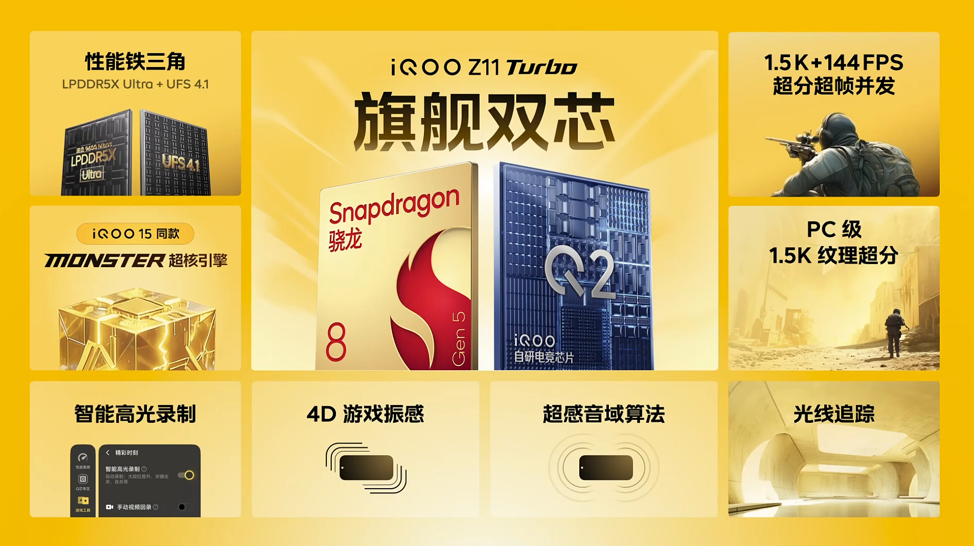 iQOO Z11 Turbo 性能这块也是旗舰配置,骁龙 8 Gen5处理器搭配LPDDR5X Ultra和UFS4.1内存组合,安兔兔跑分干到359万分以上了,还有全新一代的Monster 超核引擎,游戏响应速度更快更流畅,支持王者荣耀144高帧率模式+极致画质,并且通过KPL比赛用机认证。自研电竞芯片Q2可以实现超分超帧,游戏体验直接拉满,过年开黑又有新选择了!