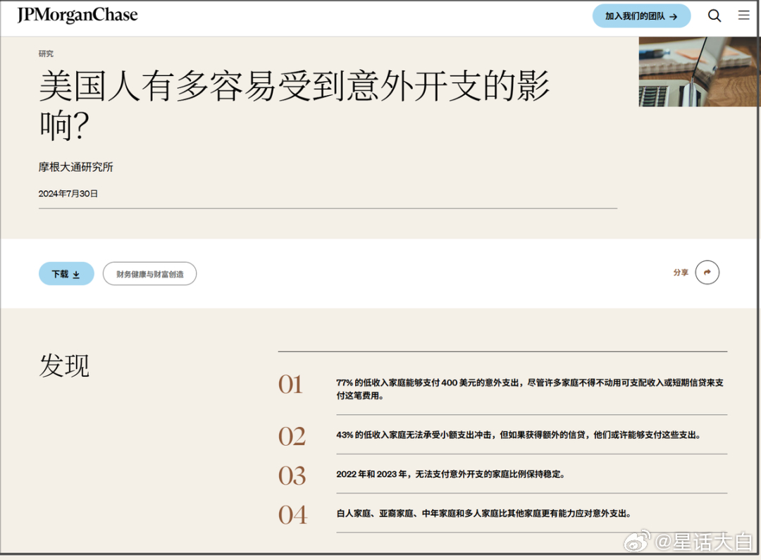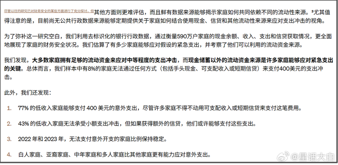 这个留言拿摩根大通的报告来对斩杀线进行“辟谣”,说美联储样本数少,摩根大通的调查样本扩大500倍,直接用银行流水,结果比例从37%,骤降至8%;于是,我还特意去摩根大通网站查了下这篇报告。结果我发现,摩根大通报告里所谓8%这个数字,跟美联储统计口径是完全不一样。这份报告原文是说:“样本中有8%的家庭无法通过任何方式(包括手头现金、可支配收入或短期信贷)来支付400美元的支出冲击。”要注意,这里说的是“整体样本的8%”,并且是“无法通过任何方式”,包括“包括手头现金、可支配收入或短期信贷”来支付400美元意外支出。而美联储的37%拿不出400美元应急资金,是包括信用卡支付、借钱、变卖东西、短期信贷、使用发薪日贷款、存款预支或透支,等现金储蓄之外的支付方式。一个是包括各类现金之外支付方式,统计出的37%,一个是“无法通过任何方式支付”统计出的8%;二者统计口径是完全不一样,所以该留言说成,摩根大通是在同样统计口径下,把美联储37%的比例,降至8%;这才是真正在造谣。而且,美联储报告里,真正完全无法支付400美元的美国人比例是13%,跟摩根大通给出的8%比例,相差并不大。而不管是8%,还是13%,这样一个比例的美国人,无法通过任何方式支付400美元的意外支出,这本身就已经是一个相当恐怖的比例。但这些着急给斩杀线辟谣的人,却理所当然的把这么一个恐怖的事实,当做拿来洗白的点,这多少是有些魔幻。