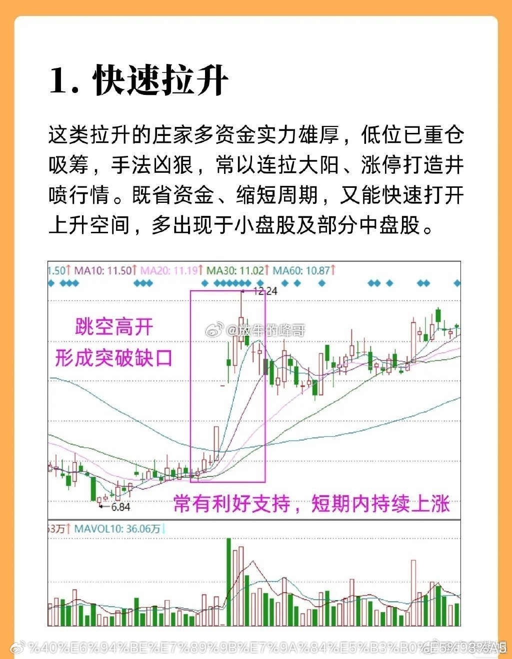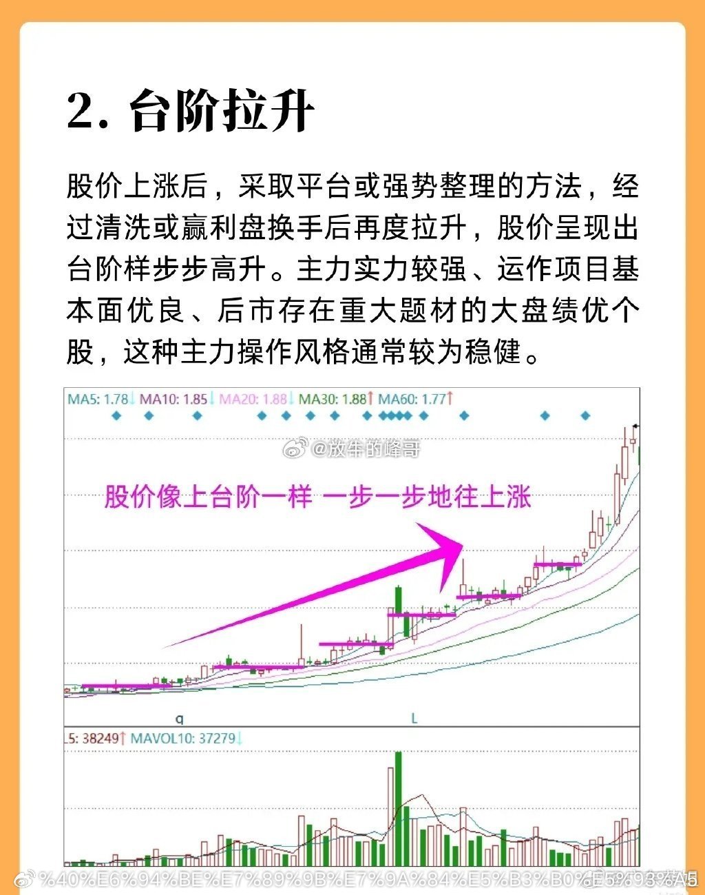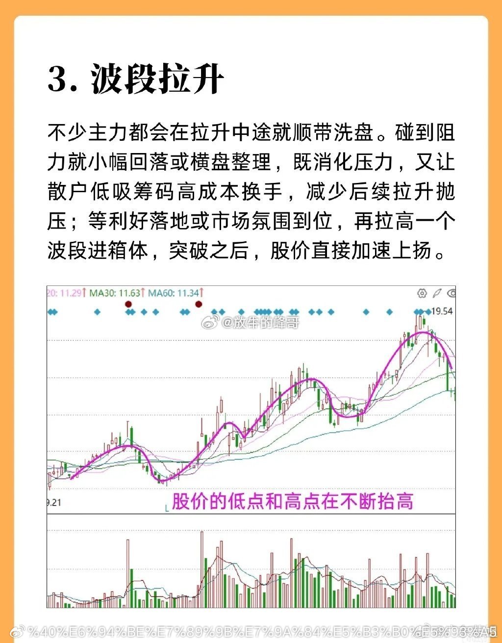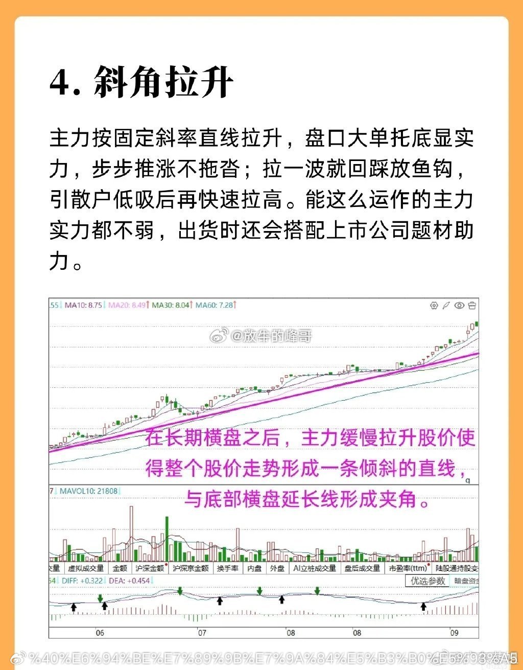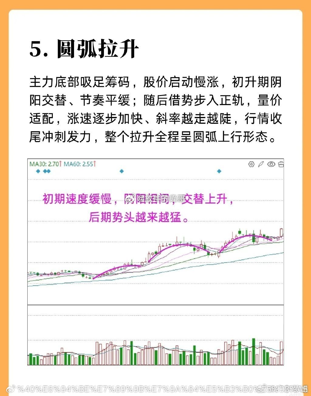 股票拉升阶段的走势,讲解了五种拉升类型:1. 快速拉升:由资金雄厚的庄家操作,常通过连拉大阳、涨停制造井喷行情,多出现于小盘及部分中盘股,通常有跳空高开形成的突破缺口,且常有利好支持,短期内持续上涨。2. 台阶拉升:股价上涨后先经平台或强势整理、完成清洗或获利盘换手,再再度拉升,呈现台阶状步步高升的形态;多由实力较强的主力运作基本面优良的绩优股,操作风格稳健。3. 波段拉升:主力拉升中途会伴随洗盘,遇阻力时小幅回落或横盘整理,以消化上涨压力、促使散户高成本换手,减少后续抛压;待利好落地或市场氛围好转,再拉高一个波段进入箱体,突破箱体后股价往往快速上扬,整体表现为低点和高点不断抬高。4. 斜角拉升:主力按固定斜率直线拉升,盘口有大单托底彰显实力,拉升过程中会回踩诱使散户低吸,之后再快速拉高;能如此运作的主力实力不弱,出货时还会搭配上市公司题材助力。5. 圆弧拉升:主力底部吸足筹码后启动慢涨,初升期阴阳交替、节奏平缓,随后量价适配,涨速逐步加快、斜率变陡直至行情冲刺,全程呈圆弧上行形态,初期缓慢、后期势头迅猛。