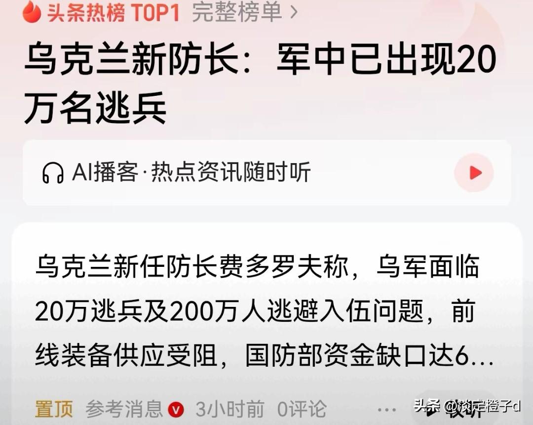 20万逃兵+69亿缺口 俄乌战要停了? 乌军20万士兵跑路200万人避役。1月14日,34岁的乌克兰新任国防部长费多罗夫向议会摊牌,这位原数字转型部长如今扛着国防大旗,主打给军队装无人机,却实打实曝出一堆烂摊子。 他直言1000公里前线装备供应卡壳,军中官僚主义扎堆,管理模式老掉牙,“不能用新技术打仗还守着旧架构”。更扎眼的是,20万人当了逃兵,200万人躲着不参军,国防预算还缺69亿美元。泽连斯基已提交延长战时状态90天议案,俄军却新控制顿涅茨克两个定居点,乌军虽称袭击俄境内设施,实则兵力捉襟见肘。 美西方把乌克兰当棋盘上的棋子,拜登要其战到最后一人,特朗普嘴甜没实质动作。乌克兰经济凋敝贫困率飙升,全靠举债度日,之前就有逃兵比伤亡还多的说法,如今人心彻底散了,没人愿意当炮灰。俄罗斯稳扎稳打,乌军撑得越久丢地越多,谈判筹码越薄。 这场仗真能在2026年上半年结束?评论区来聊聊。