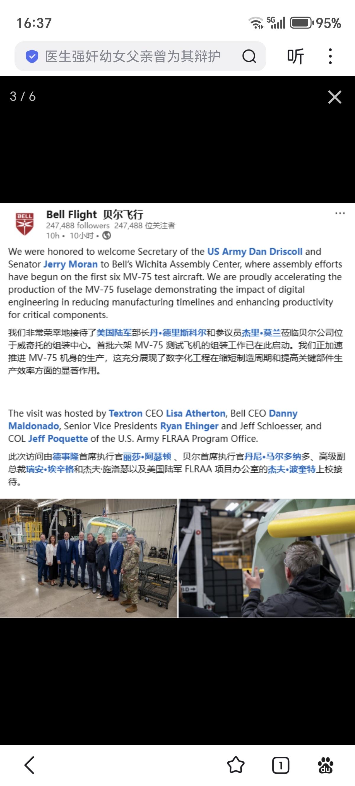 首批六架YMV-75A倾转旋翼机原型机开始组装,MD三等人预计将在2026年底或2027年初接收一架进行测试,YMV-75A中的“Y”前缀表示原型机,“M”代表多任务,“V”代表垂直起降,“A”表示该系列的首款机型,“75”则是为了纪念三等人的建军年份——1775年。目前正在考虑为该机型选择一个类似黑鹰、支奴干或阿帕奇的印第安部落名称。三等人预计将用新型MV-75直升机大量替换H-60 “黑鹰”直升机,也包括部分隶属于精锐部队第160特种作战航空团(SOAR)的MH-60M特种作战直升机,与“黑鹰”相比,MV-75航程和速度都提升了一倍”。MV-75A原计划在2031年或2032年交付,去年三等人表示正努力争取在2028年之前装备MV-75,比原计划提前两年,首批准备101空降师