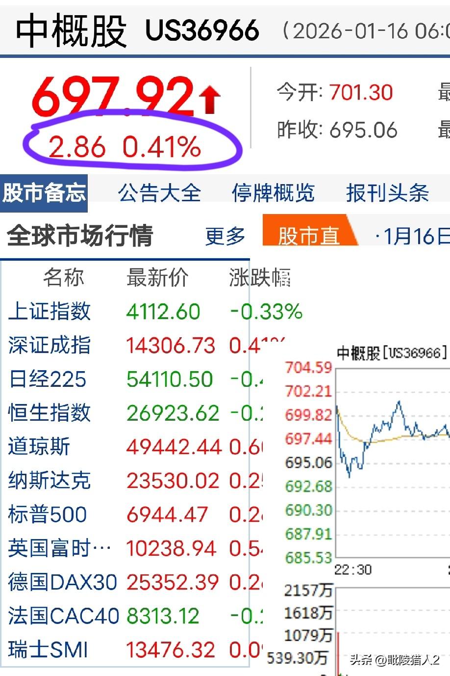 1月16日早评。隔夜美股三大指数全线反弹,高开低走收小阳线(图1、2),中概股走势与大盘类同(图3)。值得关注的是,自中国禁止白银出口后,COMEX白银价格一路上涨,目前已来到93.4美元/盎司,如果以一周前的均价75美元/盎司计算,短短一周涨幅达惊人的24%。另外,近一周来,镍价大幅上升。总体而言,资源类大宗商品价格呈上涨趋势。 今天A股期指交易,14400多手、创历史之最的总空单预示今天多空将有一场恶战。为了稳定市场情绪,央行昨日盘后发布的降息消息。 理性分析,在当下管理层要求市场降温的前提下,今天多头爆击空头的概率不大。预计指数将有较大波动。但如果调整幅度较大的话,尾盘是有搏反弹的机会的。 板块上关注资源类大宗商品,有色、小金属涨价逻辑没有改变。从商业航天和AI应用出来的资金,有可能会慢慢抄底前期一直调整的CPO、PCB、电子元件等板块。 个人观点,不构成投资依据,不喜勿喷。祝大家今日好运。