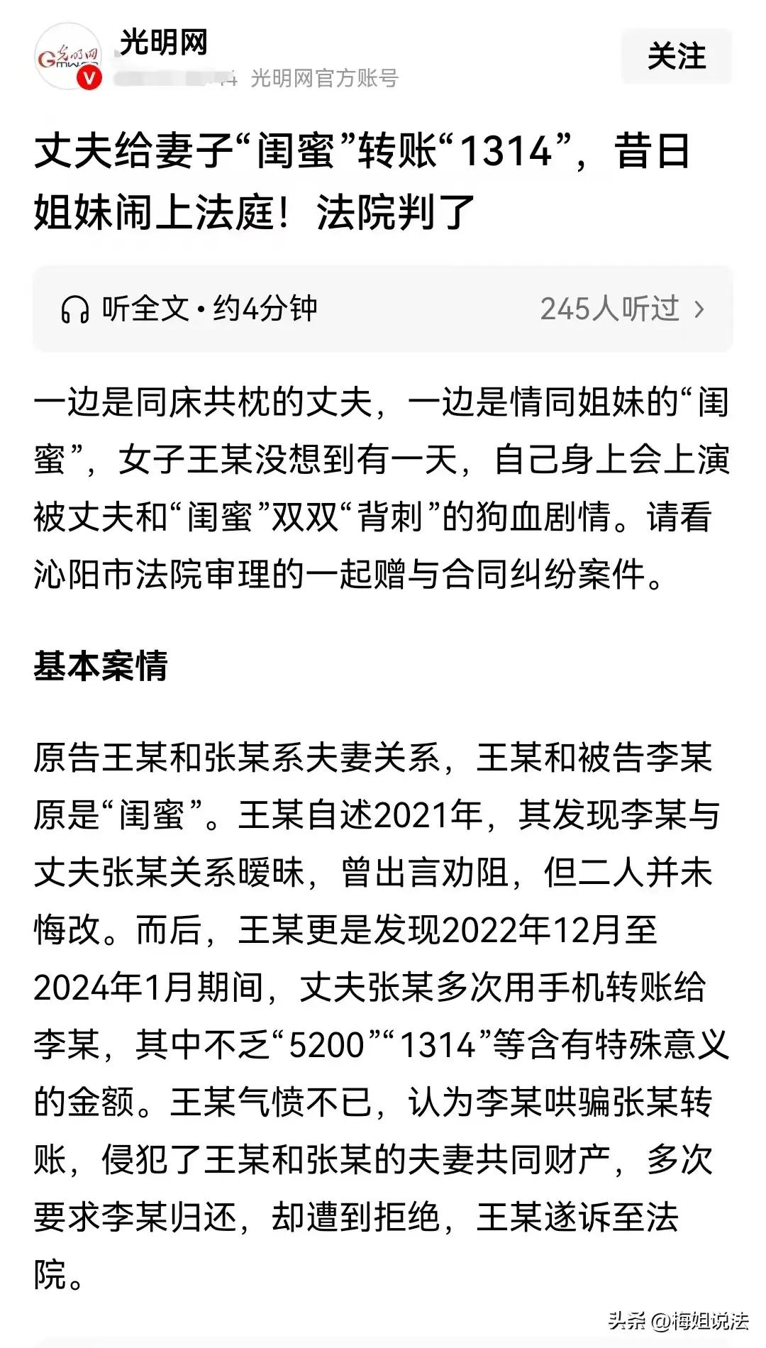 河南沁阳,女子发现丈夫和闺蜜竟然来往密切,女子出面阻止二人却变本加厉,丈夫还给闺蜜转5200和1314,女子找闺蜜算账对方拒不认账。女子气炸了,起诉闺蜜要求返还夫妻共同财产79677.43元及利息。 河南沁阳,这个曾经平静的小城,突然被一场家庭和友情的“地震”搅得沸沸扬扬。事情的起因看似普通,却深藏人性的复杂与脆弱。一个女人在无意中发现丈夫和闺蜜的秘密来往,本以为只是普通的误会或误解,但当她出面阻止,迎来的却是二人变本加厉的态度。更令人震惊的是,丈夫竟然在背后给闺蜜转账5200元、1314元,这不仅仅是数字的游戏,更像是一场情感的背叛和金钱的交易。 你是否曾经相信过爱情的纯粹?你是否曾经觉得友情是无价的?但现实告诉我们,人在利益面前,很多时候都变得脆弱不堪。这个女子的愤怒,不仅仅是因为背叛,更是对自己曾经信任的人的失望。她试图用理智和法律来维护自己的权益,却发现,真相远比想象中复杂。 面对闺蜜的拒不认账,她没有选择沉默,而是站出来,毅然起诉要求返还夫妻共同财产——整整79,677.43元及利息。这一数字背后,是一个女人对自己家庭的责任感,是对背叛者的愤怒,也是对自己尊严的捍卫。这个案件,不只是一起财产纠纷,更像是一面镜子,折射出在现代社会中,家庭、友情、信任的脆弱与坚韧。 这起事件让人不禁深思:在利益的诱惑下,多少人会迷失自我?我们又该如何守住那份纯真的信任?或许,每个人都曾在爱情和友情中迷失过,但真正的勇士,是那些在风雨中依然坚持自己底线的人。这个女子的故事,或许只是千万家庭中的一个缩影,但它提醒我们:无论何时何地,保护自己,坚守底线,才是最值得珍惜的财富。 所以,朋友们,你怎么看待这场家庭与友情的“战争”?你是否也曾遇到过类似的背叛?欢迎在评论区留言,让我们一起为那些在风雨中坚持自我的人鼓掌,也为那些迷失的人点亮一盏灯。因为,只有经历了风雨,才能看到最璀璨的彩虹。闺蜜烦心事 闺蜜和对象吵架