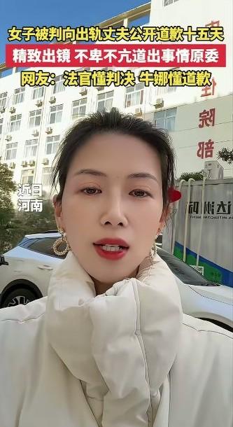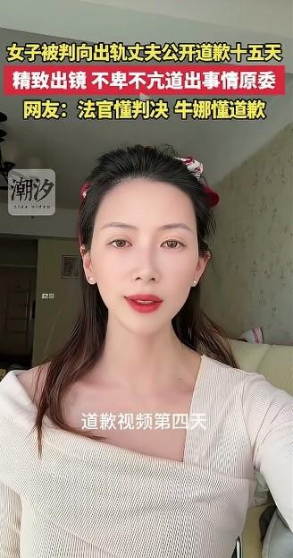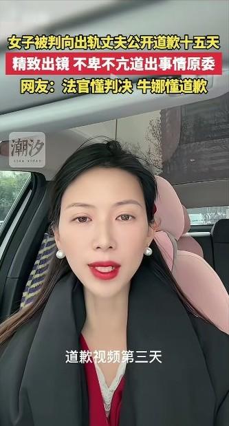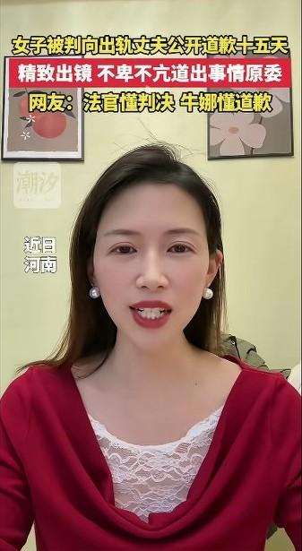 女子向出轨丈夫公开道歉15天!如实履行法院的判决。 原因是这名女子的丈夫出轨了已婚女同事,被女子发现后,丈夫恼羞成怒,对自己的妻子实施了家庭暴力,女子对丈夫使用了不文明的词语。 从网传的视频画面可以清晰的看到,原配长得很漂亮,也非常的有气质,道歉的时候也不卑不亢。 最重要的是,这名女子非常有理性,既然法院判决公开向丈夫道歉15天,那就一点折扣都不能打。 她的丈夫高飞这一下就火出圈了。