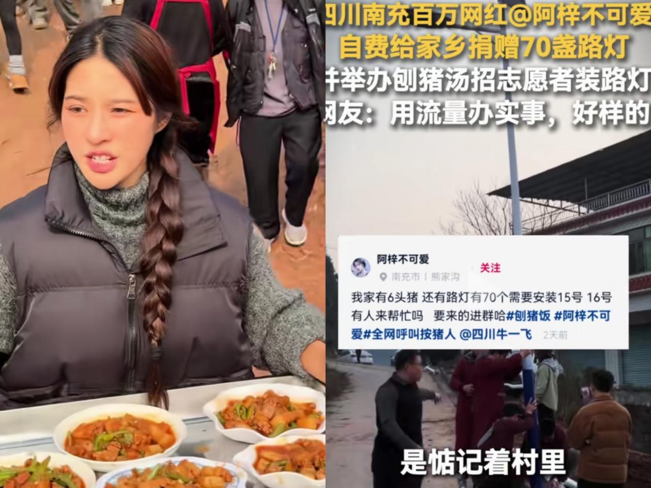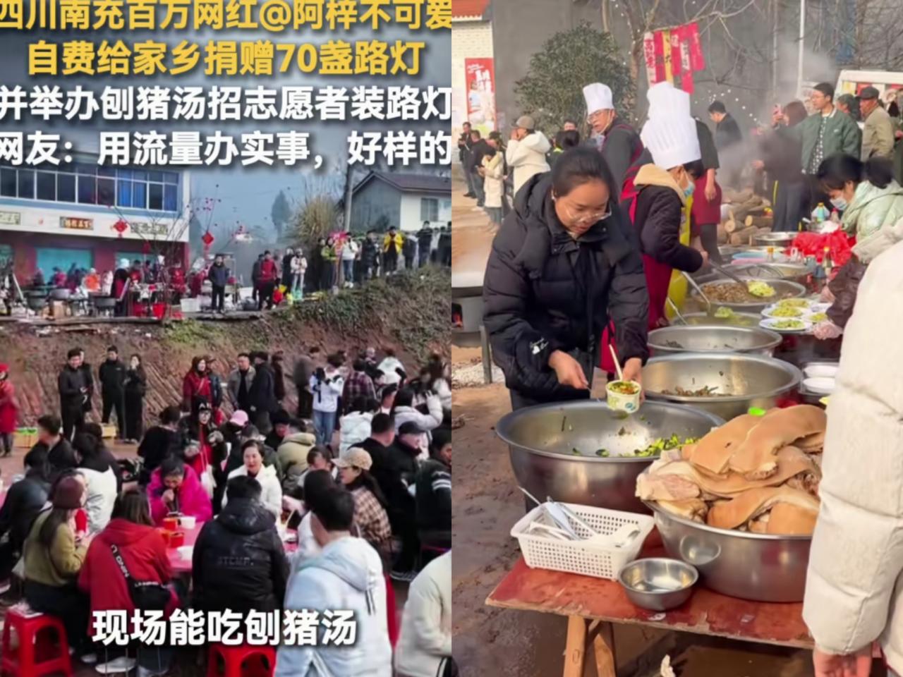 不得了!刨猪宴多地开始复刻! 看了下,其中复刻最成功的,当属四川南充的网红阿梓。 这也是阿梓自深圳东门“恶龙咆哮”之后,人气最高的一次。她自掏腰包拿出六头猪,办开出的条件是,来吃席的网友必须帮村里安装路灯。(路灯也是她自掏腰包) 另外比较加分的是,阿梓全程有开直播,但是关闭了打赏功能,这一举动格局立马就不一样了。 为了办好此次活动,阿梓特意从杭州请了一位从业20多年的资深专家维护现场秩序,关键是对方还不收工资。 视频中看到了,她爸爸一身保安服在人群中穿梭,网友戏称:“碧桂园五星上将”都来维持秩序了。 阿梓的高明之处是,分批吃席,一次多少人,先让远方的朋友吃,一波接一波,现场井然有序,每个路口都有人维持交通秩序。 车子停的远的中巴车接送,吃完饭,自行把自己用的碗筷扔进垃圾桶里,桌面收干净,下一波接着。 更绝的是,她家距离呆呆的家仅有60多公里,附近的网友算是有口福了。,吃完那家吃这家。 据说摆渡车是阿梓联系的,8辆车,1千元一天,但至少去了有8000多人,准备的几头猪早不够用了。 后来当地文旅联系了10辆,共计18辆,因为客流量大,司机很辛苦,最后给司机开的是1千3元一天。 阿梓在直播间透露了一点,当地相关部门和她说,小打小闹就可以了,不会像重庆呆呆那边给兜底,见好就收。 个人办这集体活动,只要不出现抢饭和踩踏,交通安全事故及环境问题就算成功,阿梓都做到了,背后应该有高人。 天道酬勤,成功不忘本,阿梓姑娘一路骂声中走来,用自己的影响力带动一方热土。其它地方的刨猪宴,好多都是抄了作业,但没抄答案。 南充刨猪汤 媒体评“刨猪宴”爆火