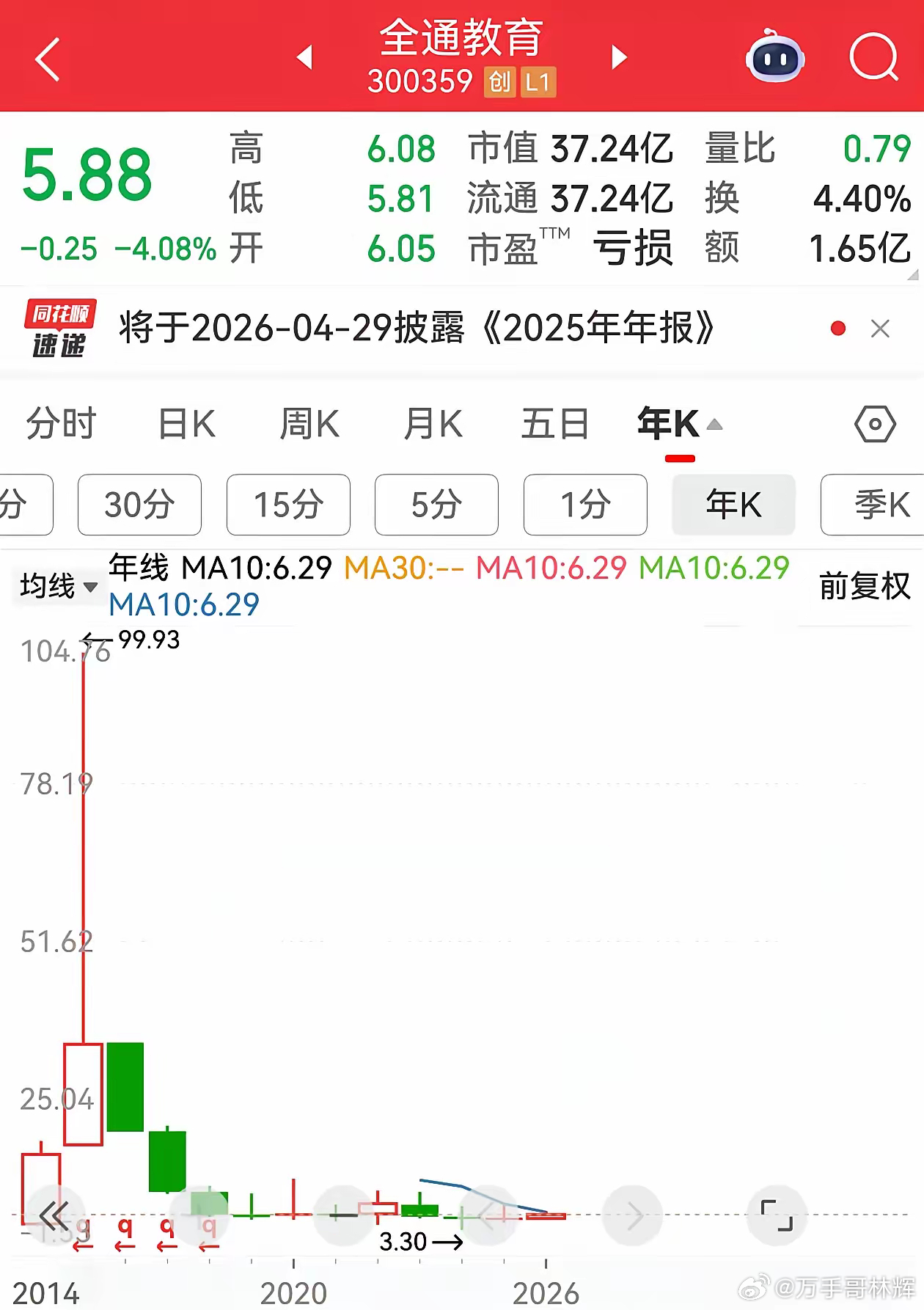 当年全通教育1600倍市盈率神话破灭,可现在这些股票正在重演当年相同过程老一点的股民有可能还记得2015年3月25日,全通教育股价达到348元巅峰,市盈率超过700倍,成为A股“第一高价股”。那一年,各路机构研报为这只股票描绘着万亿级在线教育市场的美好前景,投资者们在论坛里调侃:“公司自己都觉得自己不值这价位,但是市场任性,你也没办法!”。短短几年时间,这只曾经力压茅台的“妖王”股价一泻千里,市值蒸发已超过九成。全通教育的疯狂之旅始于2014年1月21日上市。头顶“中国教育信息服务第一股”光环,这家在线教育公司的股价从30.31元的发行价开始,仅用14个月就登上了199.9元的位置,成功超越贵州茅台。2015年,全通教育达到了资本市场的巅峰。那一年3月25日,公司股价盘中创下348元的历史纪录。5月13日,股价更是一度触及467.57元的“天价”,动态市盈率超过1600倍。可惜潮水退去,全通教育的坠落同样触目惊心。从467.57元的高点到如今的股价,这家公司的市值已经缩水超过92%。全通教育的风险警示公告如今读来颇具讽刺意味。公司曾在其股价达到320.65元时发布公告,明确指出:“公司股票动态市盈率为748.2倍,偏离公司所处软件和信息技术服务行业平均动态市盈率125.12倍的幅度较大。”实际上,这家公司的真实盈利能力远无法支撑其神话般的市值。2014年全通教育实现营业收入1.9亿元,净利润4487万元,分别仅增长11.8%和6.87%。可惜的是全通教育的阴影并未消散,类似的剧本目前正在当下市场不停的上演。今年的好多牛股有些连市盈率还是负的。真正的投资者是很看重市盈率的。因为市盈率是衡量公司估值的关键指标之一。它通过“公司总市值/年度净利润”或“股价/每股收益”计算得出,可以理解为按照公司目前的盈利能力,投资者需要多少年才能回本。可现在500多倍市盈率的公司还有人疯狂的抢着买入,有人能活500多岁吗?真正的投资,需要基于对公司价值的理性判断而非市场情绪的表象。当你看到一家公司市盈率超过行业平均水平数倍甚至十倍时,当公司自身都发出风险警示时,当“击鼓传花”效应明显时,请停下手中的操作,远离这样的“热闹”。全通教育如今静静地躺在A股市场中,股价仅为巅峰时期的一个零头。那些曾在300元以上买入的投资者,如果没有及时止损,恐怕将面临数十年甚至一生都难以回本的现实。市场总有新的热点、新的故事、新的“全通教育”正在形成。我们投资者需要做的就是成为一个看客,不然潮水退去下场是很惨的,