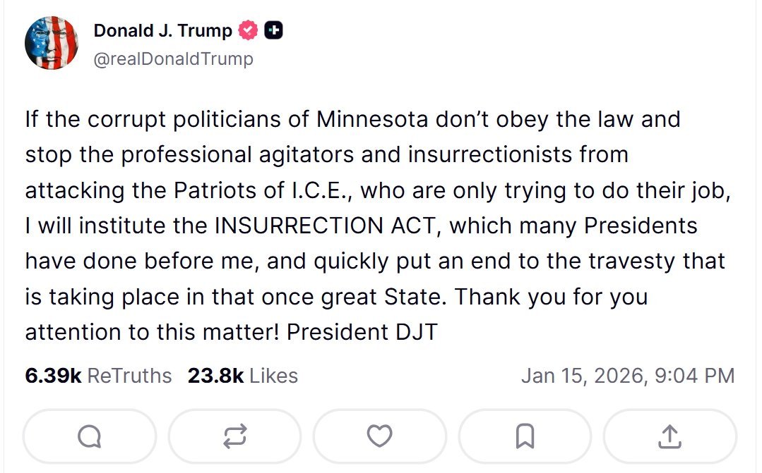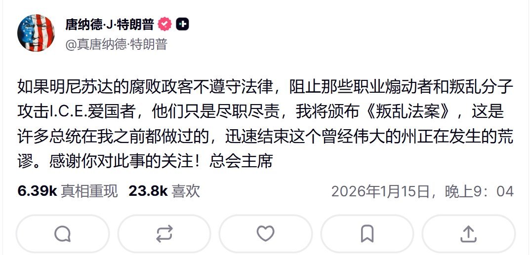 特朗普威胁援引《叛乱法案》应对明尼苏达州局势——《叛乱法案》可以授权美国总统在特定条件下部署美军或国民警卫队在美国本土镇压“叛乱”。热点观点烽火问鼎计划
