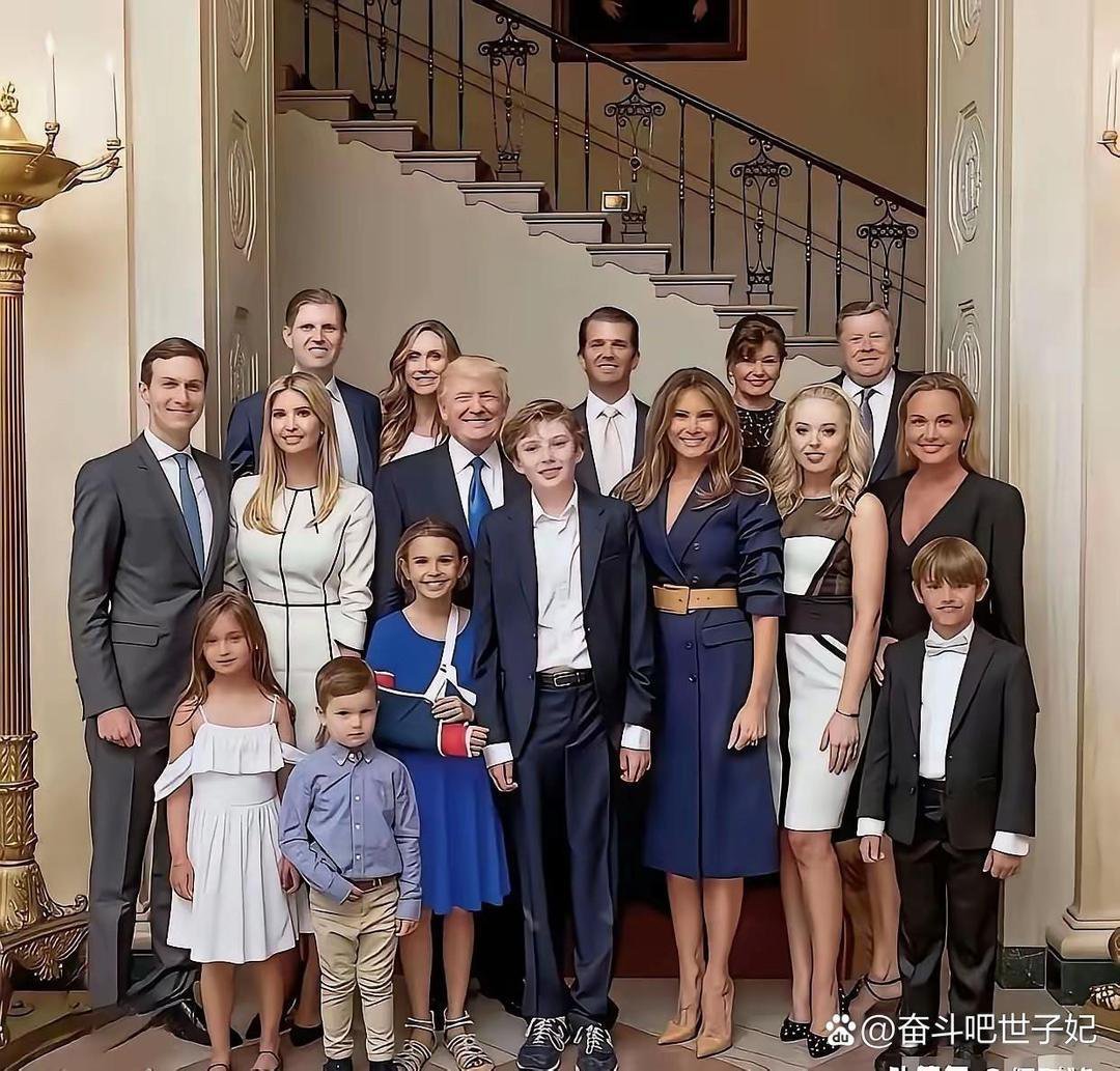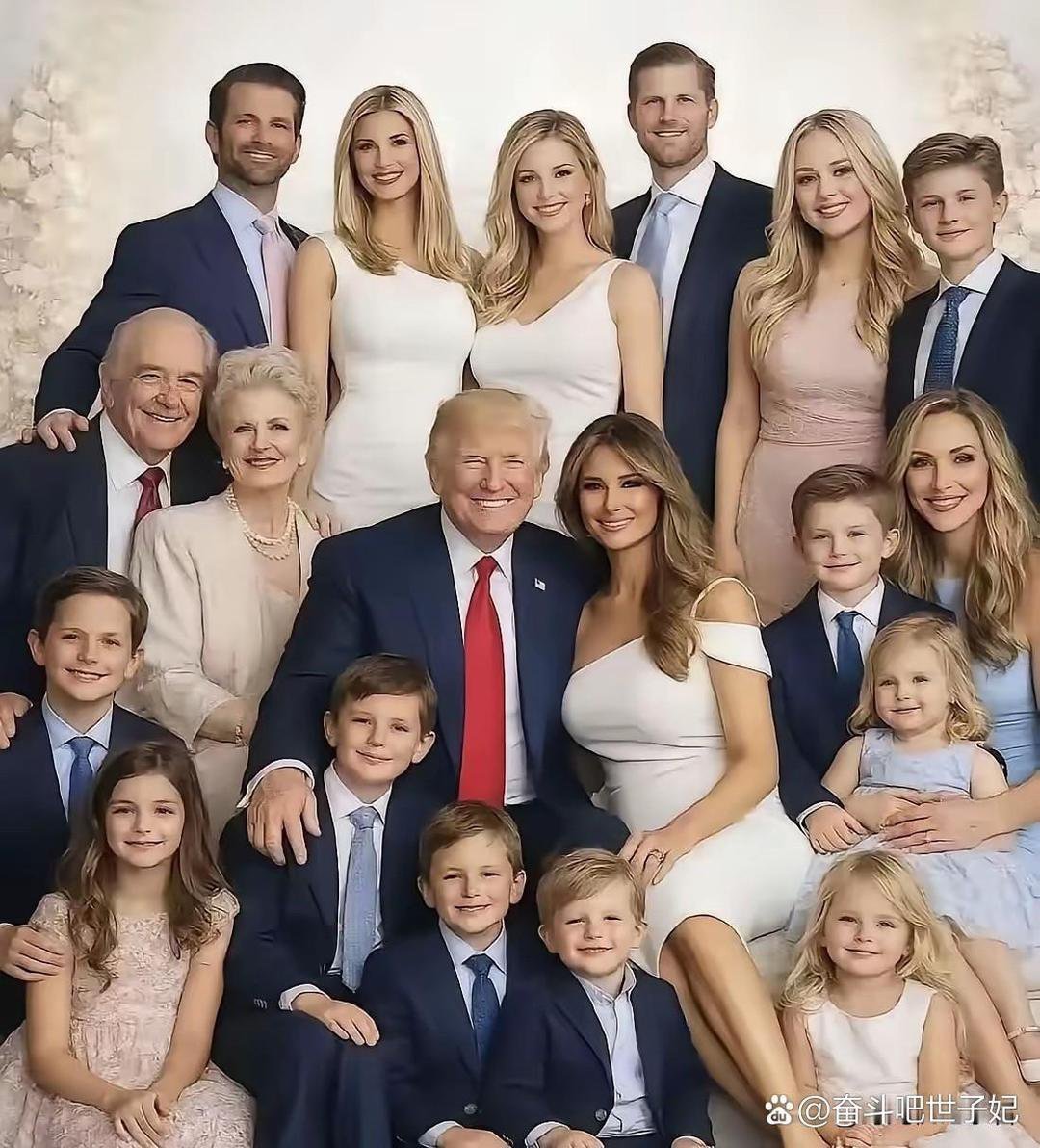 特朗普一家合照真的太惊人了,竟然肤色一模一样,就连儿媳妇都一样,只有他的现任妻子