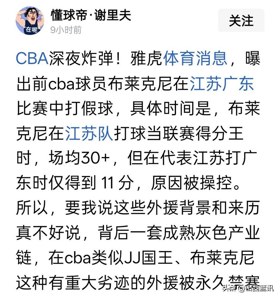 CBA前外援被爆出对阵广东男篮时打假球!媒体人披露,援引雅虎体育消息称:前CBA江苏男篮外援布莱克尼曾经代表江苏男篮与广东男篮打比赛时,全场仅得到11分。这个媒体人指出:原因被操控!要知道的是,布莱克尼当赛季是CBA的得分王,他的得分能力场均30+。唯独对阵广东男篮少拿了20分。那么,球迷不禁要问:被谁所操控?谁是幕后主使?为啥正好是江苏男篮与广东男篮比赛是被操控?操控者与广东男篮有没有关系?建议CBA官方严查深究!