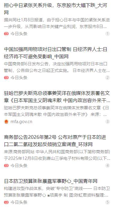 五常已做选择!随着中日矛盾的不断升级,五大常任理事国终于不再沉默,纷纷做出了自己的选择。事情得从1月6日说起,中国商务部发了个公告,内容很简单:对日本搞“两用物项全面出口管制”。 麻烦看官老爷们右上角点击一下“关注”,既方便您进行讨论和分享,又能给您带来不一样的参与感,感谢您的支持!   2026 年开年,亚太局势就被日本的一系列激进操作搅得暗流涌动。日本首相高市早苗公然突破底线,将中国台湾问题与日本所谓 “存亡危机事态” 挂钩,这番涉台错误言论严重触碰一个中国原则红线,激起国际社会广泛谴责。   与此同时,日本内阁在扩军路上越走越远。2026 财年防卫预算高达 9.04 万亿日元,实现连续 14 年增长,其中单独列支 9733 亿日元专门发展 “对敌基地攻击能力”,还在推进远程导弹研发、潜艇发射导弹项目,明显背离战后 “专守防卫” 政策。   日本的挑衅行径自然不会换来纵容。2026 年 1 月 6 日,中国商务部果断发布公告,对日本实施 “两用物项全面出口管制”,精准掐住其军工产业的关键供应链。   紧接着在 1 月 7 日,商务部再出重拳,正式启动对原产于日本的二氯二氢硅反倾销调查。这种化学原料是芯片制造的核心材料,日本半导体产业对其需求极大,这一举措直接击中日本高端制造的 “七寸”。   作为深耕中日经济合作的业内人士,日中经济协会理事高见泽学直言不讳,日本半导体等高端制造领域短期内或许能靠库存应对,但中长期来看根本离不开中国市场和相关供应,中国的科技实力和市场规模已成为日本企业无法忽视的关键支撑。   这场博弈中,联合国五常的态度成为焦点。中俄作为二战主要战胜国,立场高度一致,明确批评日本的危险动向,指出其行为是对战后国际秩序的践踏。   英法两国则保持沉默,没有对日本的挑衅行为给予任何背书,相当于用实际态度表达了不认同。美国则选择隔岸观火,既没有公开支持日本,也没有出面调停,显然是想坐看局势发展,从中谋取私利。   中方的反制措施很快显现效果。1 月 8 日当天,东京股市日经 225 指数开盘后一路走低,最终暴跌 844.72 点,跌幅达 1.63%,收盘报 51117.26 点。   受反倾销调查和出口管制影响,信越化学股价当天下跌 3.4%,三菱化学等相关企业股价也纷纷跟跌,市场对日本半导体和化工产业的信心大幅动摇。   日兴证券的分析报告更是给出悲观预测,受中日贸易摩擦升级影响,日本上市企业 2025 财年净利润将减少 6.8%,不少依赖中国市场或供应链的企业将面临利润收缩甚至经营困难的局面。   事实上,中方的一系列反制措施完全符合国际法和国际贸易规则。二氯二氢硅反倾销调查是应国内产业申请,经过商务部依法审查后启动,调查程序合法合规,旨在维护公平的贸易环境。   而两用物项出口管制则是主权国家的正当权利,许多国家都有类似制度,目的是防止相关物资被用于军事领域,维护地区和平与安全,这一举措得到了多个国家的理解和支持。   回顾历史,中日关系的政治基础是《中日联合声明》等一系列文件,其中明确规定日本承认一个中国原则,尊重台湾是中国领土不可分割的一部分。   日本如今的所作所为,不仅违背了自身承诺,更无视《开罗宣言》《波茨坦公告》等国际法律文件确立的战后秩序,是对历史真相和国际正义的公然漠视。   值得警惕的是,日本的军备扩张已呈现全方位加速态势。除了发展 “对敌基地攻击能力”,还在太空、网络、无人作战等领域加大投入,将航空自卫队更名为 “航空宇宙自卫队”,新设 “宇宙作战集团”,意图构建跨域作战能力。   这种向进攻型军事大国转型的动向,让周边国家不得不提高警惕,毕竟历史上日本军国主义给亚洲人民带来的深重灾难,至今仍是难以磨灭的伤痛。   这场中日之间的博弈,本质上是维护国家主权、安全、发展利益与破坏战后国际秩序的较量。台湾问题是中国核心利益中的核心,任何外部势力都无权干涉,中国政府和人民有坚定的意志、充分的能力捍卫国家主权和领土完整。
