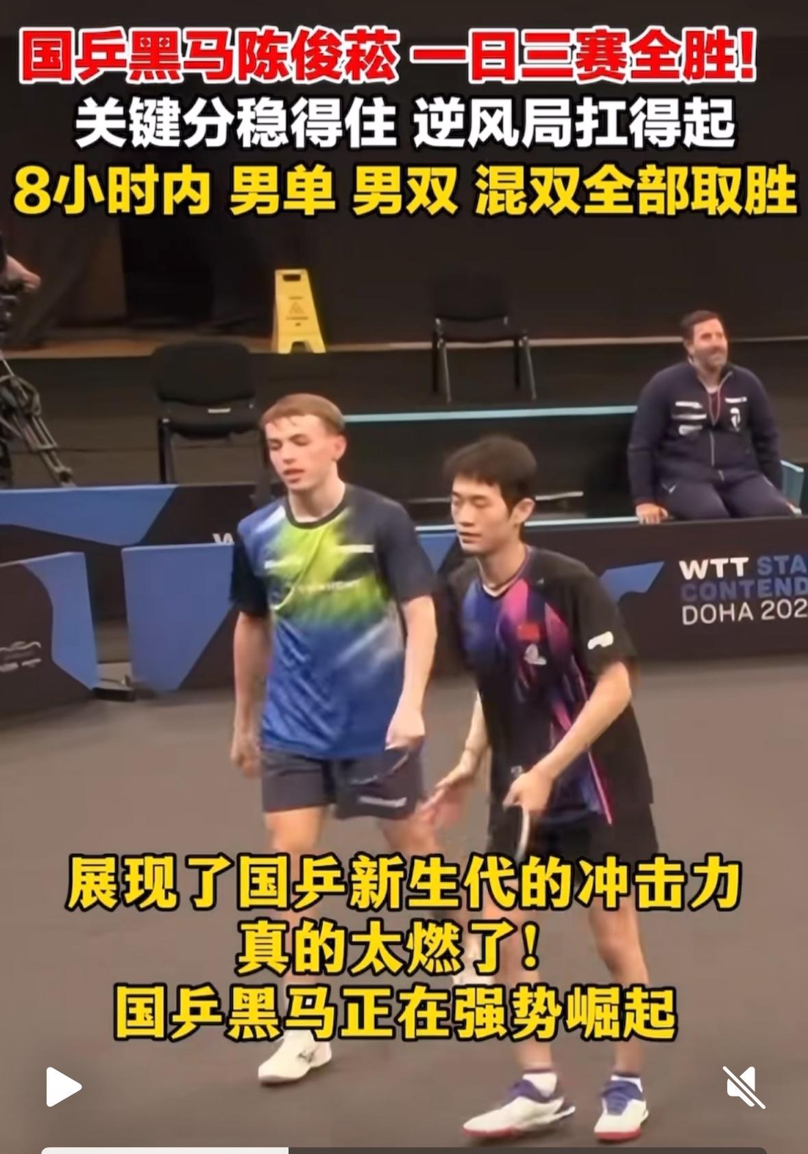 多哈球星挑战赛中的黑马陈俊菘一日三赛全部胜出—王皓指导也自信满满 1月15日,小将陈俊菘再次爆发 实力,一日三赛皆胜! 徐瑛彬/陈俊菘3:0林钟勋/安宰贤, 覃予宣/陈俊菘3:2林昀儒/郑怡静, 陈俊菘3:0法乒小将科顿! 王皓指导做陈俊菘的场外, 眼神里全是欣赏, 指导中透露着自信的鼓励, 脸上全是笑意盈盈! 8小时内,男双,混双,单打 全部晋级, 关键时刻顶得住, 逆风局扛得起, 王皓指导评价陈俊菘: 关键球果断, 抗压能力强, 未来将是国乒的主力队员! 一员猛将! 特别是陈俊菘在去年的 北京大满贯赛事中打败张本智和, 我就看好他! 国乒男队难得一见的梯队建设, 用脑子打球,拼劲十足! 陈俊菘身上有股锋锐的劲, 希望这个福建小将冲到主力层!