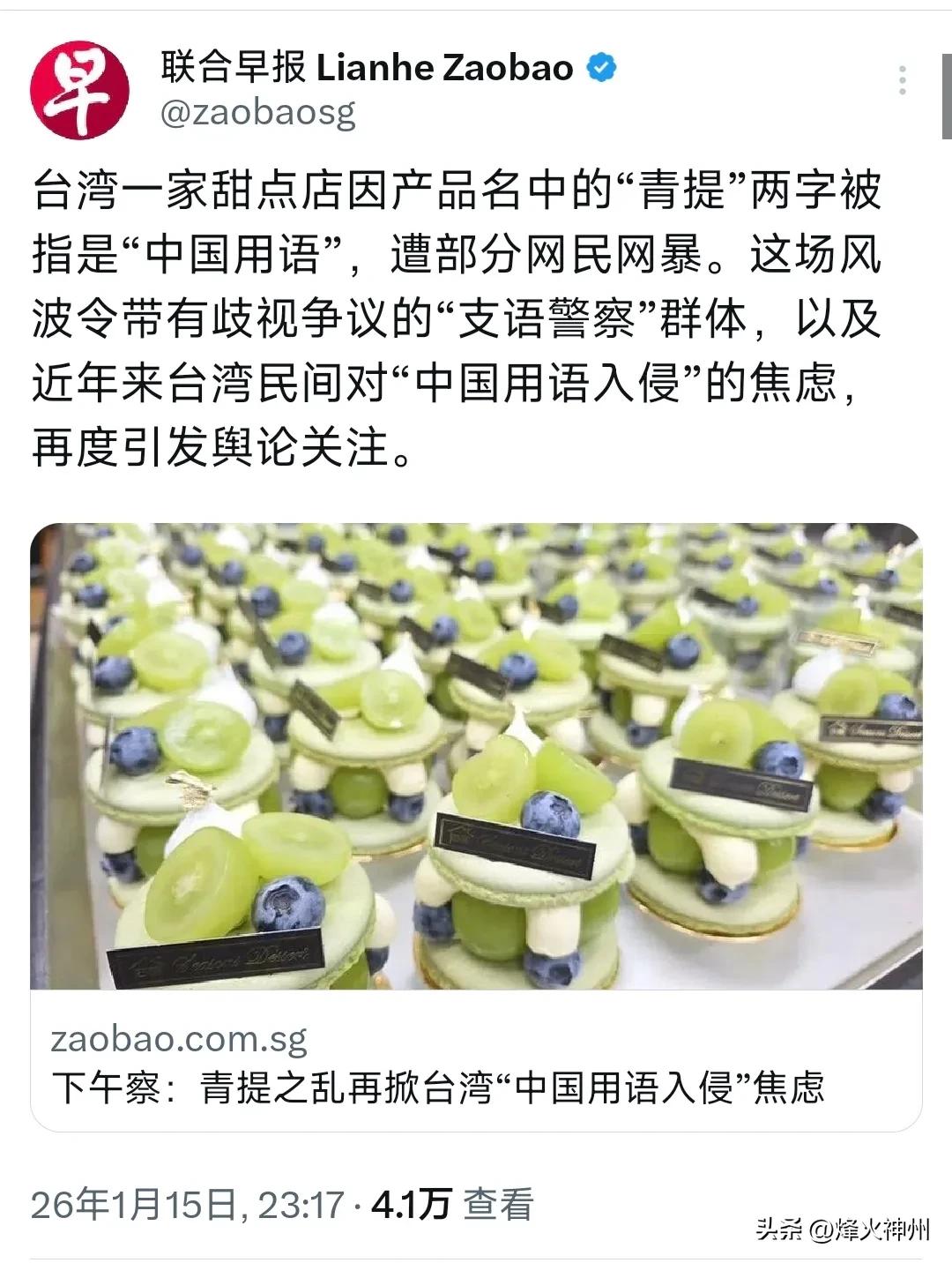 新加坡联合早报昨晚(1月15日晚)发表评论称:“台湾一家甜点店因产品名中的‘青提’两字被指是‘中国用语’,遭部分网民网暴。这场风波令带有歧视争议的‘支语警察’群体,以及近年来台湾民间对‘中国用语入侵’的焦虑,再度引发舆论关注。” 评几句: 青提成“原罪”?台湾网暴闹剧背后,是民进党遮不住的“文化台独”野心 “青提”竟成“大陆入侵用语”?台湾基隆一家甜点店只因给新品取名“青提乳酪塔”,就遭亲绿“青鸟”这类极端言论群体私信威胁、恶意刷一星差评,甚至被叫嚣“滚出台湾”,逼店家改成“绿葡萄”。这场荒诞的网暴风波,早已不是孤例——高雄甜品店曾因用“青提”命名遭围攻,书局因漫画翻译有“大陆用语”被迫下架,就连台军节目里的“质量”一词,都被追着骂“不合时宜”。 两岸同文同种,语言本就是天然的文化纽带。过去台湾的“便当”“主播”融入大陆日常,如今“青提”“充电宝”在台流行,本是交流融合的自然结果。更讽刺的是,民进党政客一边喊着“抵制大陆用语”,一边自己却频繁“打脸”:台外事部门负责人林佳龙说“更高质量的驾驶”,高雄市长陈其迈提“政策的质量”,这些被他们批为“大陆用语”的词汇,自己用得倒是顺嘴。 这一切的根源,藏着民进党当局的险恶用心。正如国台办发言人朱凤莲所言,这种非理性的病态现象,本质是民进党处心积虑操弄“去中国化”,妄图割裂两岸历史文化联结。他们把“青提”贴标签,将简体字当“敌人”,甚至把日常用语渲染成“文化渗透”,无非是想通过制造语言对立,扭曲台湾青年的历史记忆和国家认同,为“台独”铺路。 但文化的脉络从不是政治操弄能斩断的。两岸同胞说中国话、写中国字是刻在骨子里的基因,“青提”这类早已流通的词汇,更不是喊几句“抵制”就能抹去的共同记忆。民进党搞“文字猎巫”式的“文化台独”,既违背语言发展规律,也遭到多数台湾民众反感,网友直言“被洗脑到无脑”“幼稚又无良”。