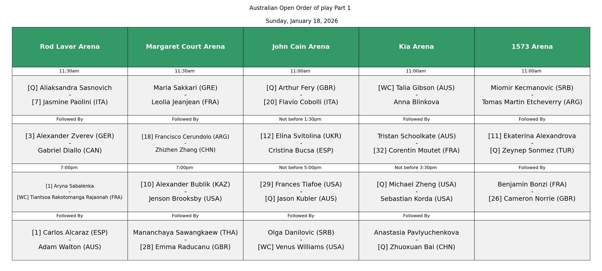 澳网2026 澳网首日赛程来了,鲍利尼vs萨斯诺维奇罗德拉沃尔球场揭幕战,兹韦列夫、萨巴伦卡先后出场,阿尔卡拉斯坐镇最后一场。张之臻vs塞纶多洛玛格丽特考特球场第二场,白卓旋vs帕夫柳琴科娃Kia球场最后一场。这很澳网