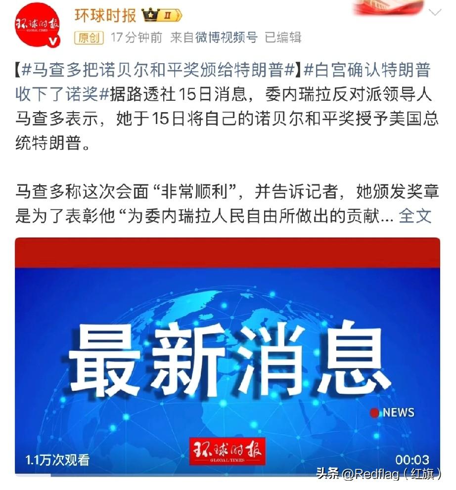 草...台班子 诺贝尔和平奖被转赠... 委内瑞拉的马查多刚拿到诺贝尔和平奖,转头就把奖章送给了特朗普,说他“帮委内瑞拉人争取了自由”。 可诺贝尔委员会早说了,这奖不能转、不能分、不能撤,纯属专属荣誉,马查多倒好,直接当人情礼送了。 最打脸的是特朗普,之前还说“奖是马查多的”,结果奖章一送上门就收下了。这哪是表彰和平,就是一场秀,把诺奖的折腾得稀碎,不愧是洋奖...