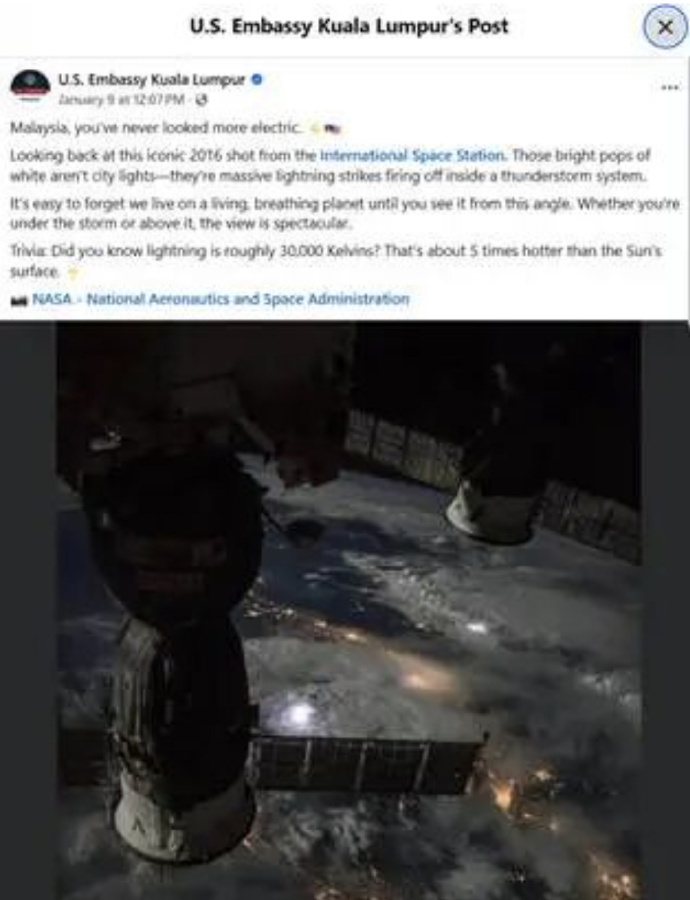 美国驻马来西亚大使馆发布一张太空拍摄的闪电照片,却引来马国网友纷纷幽默回应。许多人强调我们没有石油,并调侃本国只有Saji牌食用油,希望不要引起美方注意。网友也顺带讽刺西方人认为马国欠发达、人住在树上的刻板印象。这些调侃源于美国近期对委内瑞拉采取军事行动并控制其石油资源。