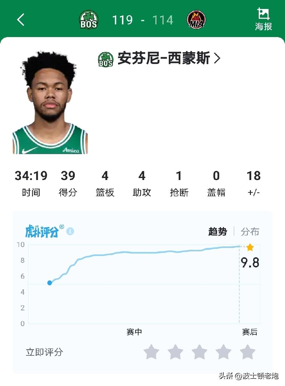 验货了验货了,进能当核心,退能打替补,2700万的到期合同,给个中锋就能卖,包你不吃亏不上当。 安芬尼西蒙斯迎来凯尔特人生涯之夜,单场命中7记三分,爆砍39分,带队逆转热火。在这场比赛之前,竟然还有人说要贴一个首轮才能送走他,闹笑话了吧,只要给够出手权,西蒙斯还是那个开拓者小开。