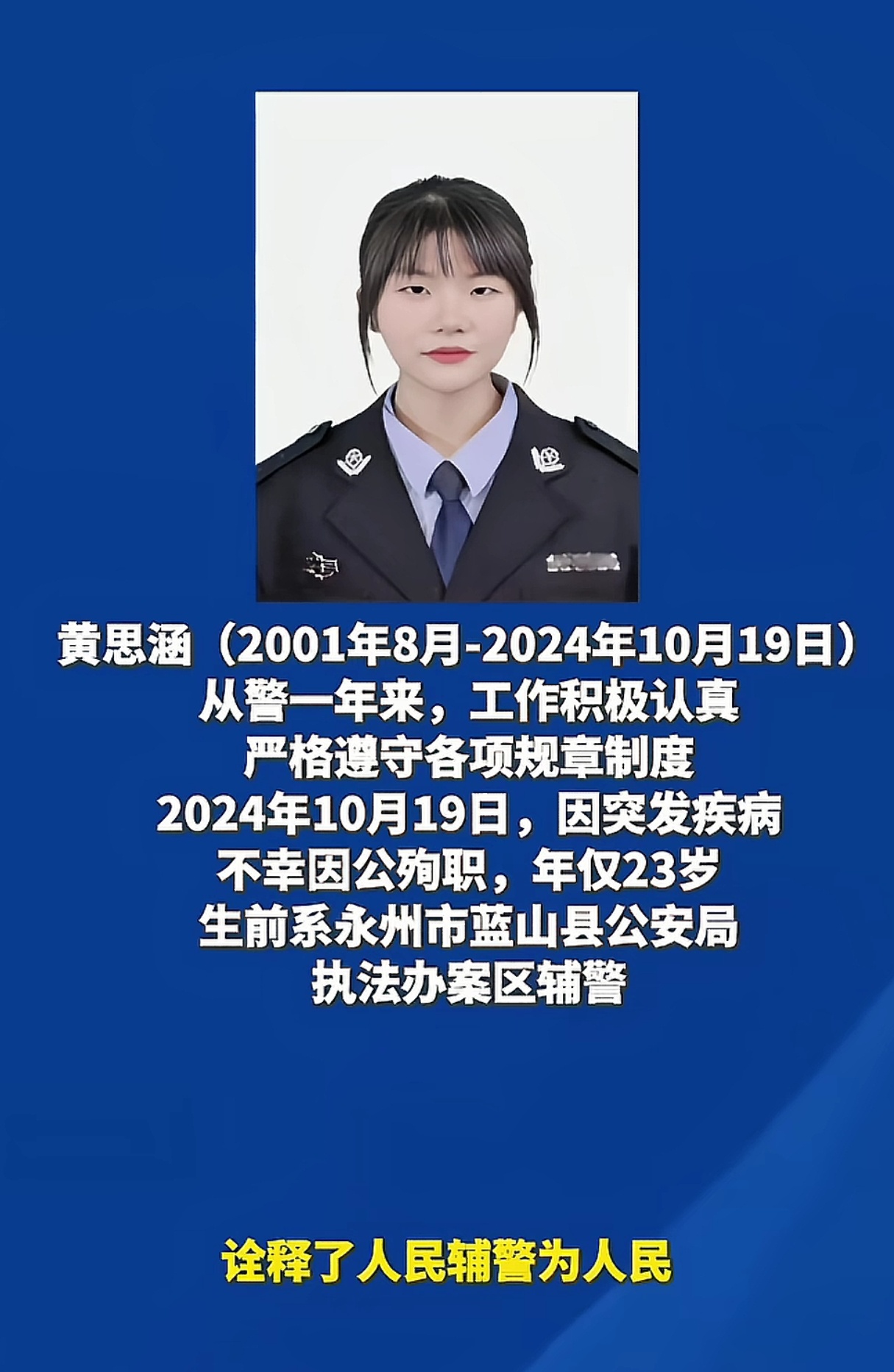 人民辅警为人民,才23岁就因公殉职了,将生命献给了为人民服务的事业上,致敬!
