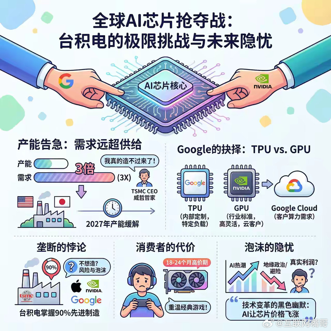 【当全球都在抢AI芯片,台积电说:我真的造不过来了】台积电CEO魏哲家最近透露了一个惊人数字:目前AI芯片的需求量是产能的三倍。全球最大的芯片代工厂,正被这波AI浪潮推到了极限。更让人焦虑的是,即便亚利桑那和日本的新工厂正在建设中,产能缓解最早也要等到2027年。换句话说,未来两三年,芯片荒还将持续。一个有意思的细节是:Google明明有自研的TPU,为什么还在疯狂采购Nvidia的GPU?答案很现实——TPU主要服务于Google内部的特定工作负载,而Nvidia GPU是行业通用标准,灵活性更高,扩展更快。更重要的是,Google云平台作为全球第三大云服务商,有大量客户需要GPU算力。在产能紧缺的当下,速度和容量比“纯粹”更重要。这场芯片争夺战背后,折射出几个值得深思的问题:第一,垄断的悖论。台积电掌握着全球90%最先进芯片的制造能力,Apple、Nvidia、Google的芯片都出自这里。有人质疑:台积电是“造不出来”还是“不想造”?毕竟在没有真正竞争对手的情况下,为什么要冒着产能过剩的风险大举扩张?如果AI泡沫在新工厂建成前破裂,谁来承担那数十亿美元的投资?第二,消费者的代价。当所有先进产能都被AI吞噬,普通消费者的显卡可能要在高价位上煎熬18到24个月。有网友调侃:是时候告别3A大作,重温二十年前的经典游戏了。第三,泡沫的隐忧。有人冷静地指出:等到下一次地缘政治危机或市场风险事件触发避险情绪,分析师们就会开始追问AI的真实利润和投资回报率。到那时,这场淘金热中的“卖铲人”们,可能会发现形势急转直下。历史上每一次技术革命的预言,都伴随着剧烈的颠覆。最终或许皆大欢喜,但在那之前,总要经历一段混乱期。AI本应解决问题,现在却先让芯片价格飞涨——这大概就是技术变革的黑色幽默。