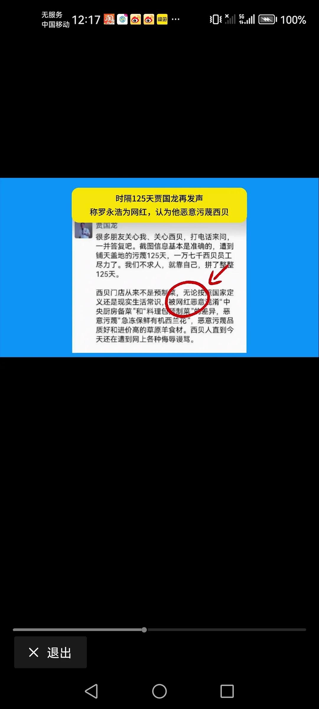时间过去4个多月了,贾老板贾国龙又站出来说,说是罗永浩恶意污蔑他们家的西贝。前几天不是宣布关店1百多家吗!看来以后很少有机会去他们家的西贝去用餐了。 有一句话是怎么说的来着? 以上仅供参考,属个人意见!