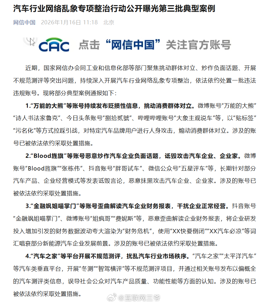 又一批汽车自媒体账号被处理,包括大家熟悉的:万能的大熊、Blood旌旗、胖哥试车,以及“汽车之家”“太平洋汽车”等汽车类垂直平台…… 一批汽车行业违法违规账号被处置