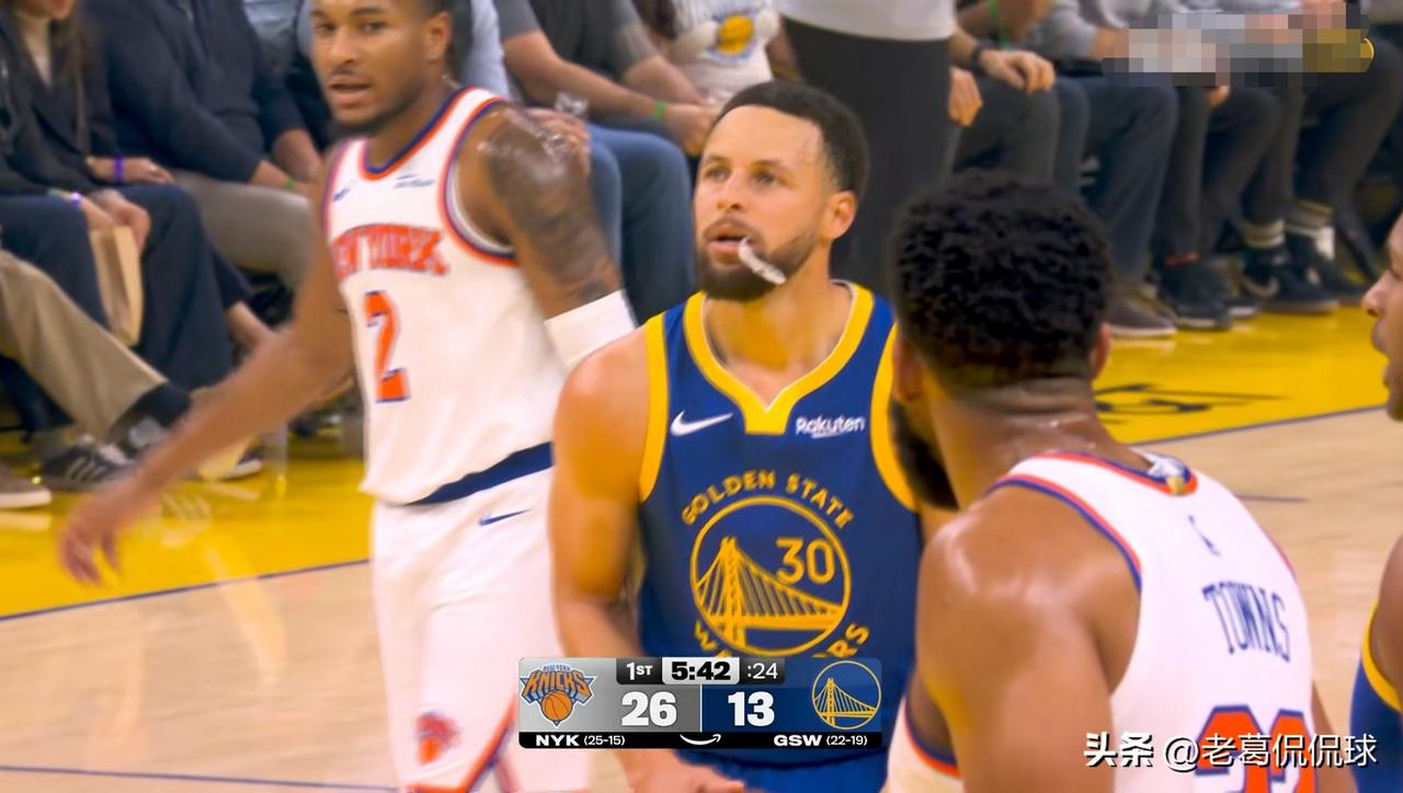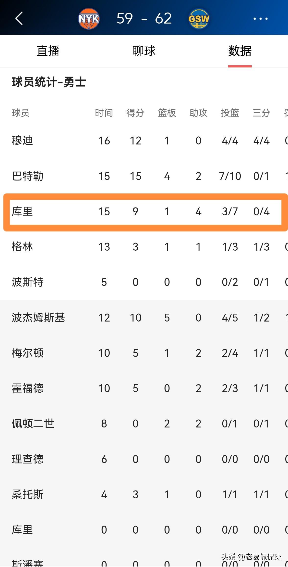 谁能想到勇士神射手库里投不进三分球?在今天勇士主场迎战尼克斯的比赛中,目前双方半场战罢,勇士以62:59领先对手3分。让人感到非常吃惊的是,NBA历史三分王库里在前两节比赛中首发出战15分钟,投篮7中3,其中三分球4中0、罚球3中3得到9分,还有3次失误,他的场上正负值为-9。