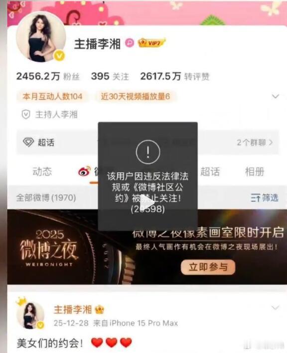 不明觉厉,李湘踩了什么红线了?炫富了?偷税漏税了?泄密了?还是什么更大的瓜?蹲一下后续,让子弹飞一会儿!李湘全平台账号被禁止关注李湘怎么了
