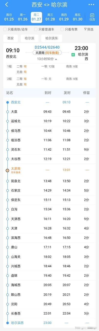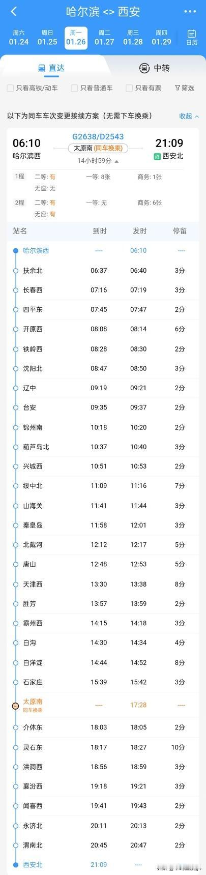 哈尔滨西站往返西安北站的直达高铁来了!1月26日起开通运营,同车换乘! 一直以来, 黑龙江到哈尔滨和陕西的西安, 一直没有直通的高铁连接, 全程普通火车需要33个小时, 并且要途经长春,沈阳,天津、石家庄,太原等多个城市和省份 而在2026年1月26日起调图以后 哈尔滨西站和西安北站增开了一趟直达列车 这趟列车全程使用两个车次, 但是是一列高铁列车, 12306里的正式名称叫同车换乘 全程不需要下车,最多就是挪一下座位 这趟列车哈尔滨西到西安北,全程需要15小时 而西安北到哈尔滨西更是13小时50分左右 全程途经哈大高铁,秦沈客专,津秦高铁,津保铁路,京广高铁,石太客专,以及大西高铁等线路 全程连接多个城市,或将都实现直达开行 这一对高铁列车又可以看成是一趟高铁两段区间拼成一条通路 G2638车次执行的是哈尔滨西至太原南区间,而D2543执行的是太原南至西安北区间,返程同理 这样,到哈尔滨看冰雪文化,还是到西安看古都历史都是更加便捷了