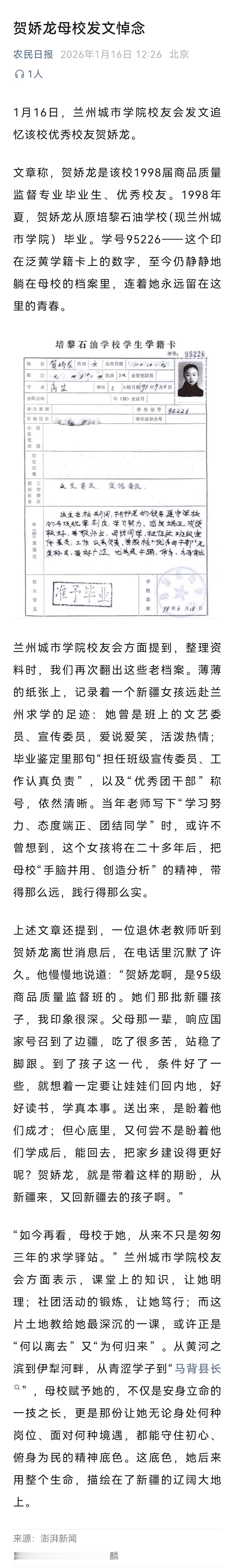 贺娇龙母校发文悼念! 贺娇在校表现优异,担任班干部,团结同学,成绩良好,爱好广泛,荣获优秀干部称号,顺利毕业。