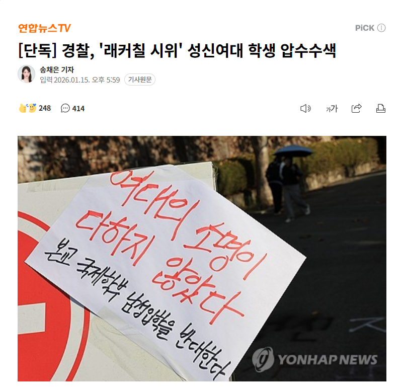 【韩国警方对"喷漆示威"诚信女子大学学生进行扣押搜查】海外新鲜事热点现场 针对反对男生入学而进行喷漆示威的诚信女子大学学生,警方已启动强制调查。首尔城北警察署于今日(14日)对诚信女子大学学生住所等地进行了扣押搜查。此次是警方首次针对诚信女子大学和同德女子大学等女子大学发生的喷漆示威进行强制调查。此前,诚信女子大学学生于前年11月针对允许男生报考的外国人特别招生制度表示反对,举行了喷漆示威,校方以财物毁损等嫌疑向警方举报了参与示威的学生。
