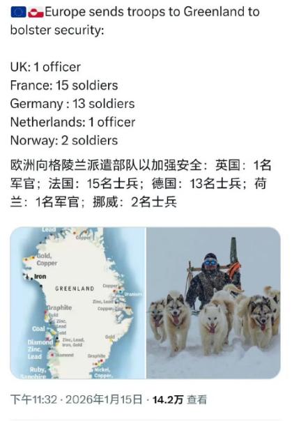 北约组织的欧洲国家是真的谨慎! 为了保护格陵兰岛,欧洲派遣了一支人数高达30多人的联合特遣部队进驻。除丹麦军队以外,还有德国13人,法国15人,英国1人,挪威2人,荷兰1人,瑞典3人,芬兰2人。这些欧洲国家,其实兵员还是挺多的,之所以派了这么点人去,估计也是因为象征性的派人。 如果派的人太多的话,可能会引起美国的警觉和反感。如果过度刺激到美国,真的把美国大军给刺激过来了,欧洲国家就有点操之过切,现在先表明一个态度,就是欧洲国家站在一起,都派兵去格陵兰岛,保卫地盘,对美国是一个试探,以及画红线。 重点不在于人多,而在于一个态度,哪怕是这些欧洲国家,派上1万到2万人的部队,到格陵兰岛驻扎,那也真要打起来,那也打不过美国军队。与其派那么多人,还不如少派,然后每个国家出点人,过去表示一下支持他们的态度。 态度是第一位的,并不是说靠人多,你就是把除了美国之外的军队,都派到格陵兰岛,那也打不过美国军队。所以说人多没有用,那只能是表达一个态度,显示、英、法、德等国,都是站在丹麦这边的。这样给了美国一个心理暗示,就是说欧洲国家是团结一致的,不能让你美国胡来。 所以既然立下了态度之后,那么就代表了欧美国家的正式博弈开始,如果美国还是硬要拿格陵兰岛的话,那么欧洲国家的军队,一步一步的增兵也可以。 另外乌克兰居然没有派人去格陵兰岛,还是挺意外的,毕竟乌克兰和丹麦关系好,有着一些共同的防务协议。而且丹麦支援乌克兰,也是非常凶猛的,此刻乌克兰不派人,是不是说不过去。