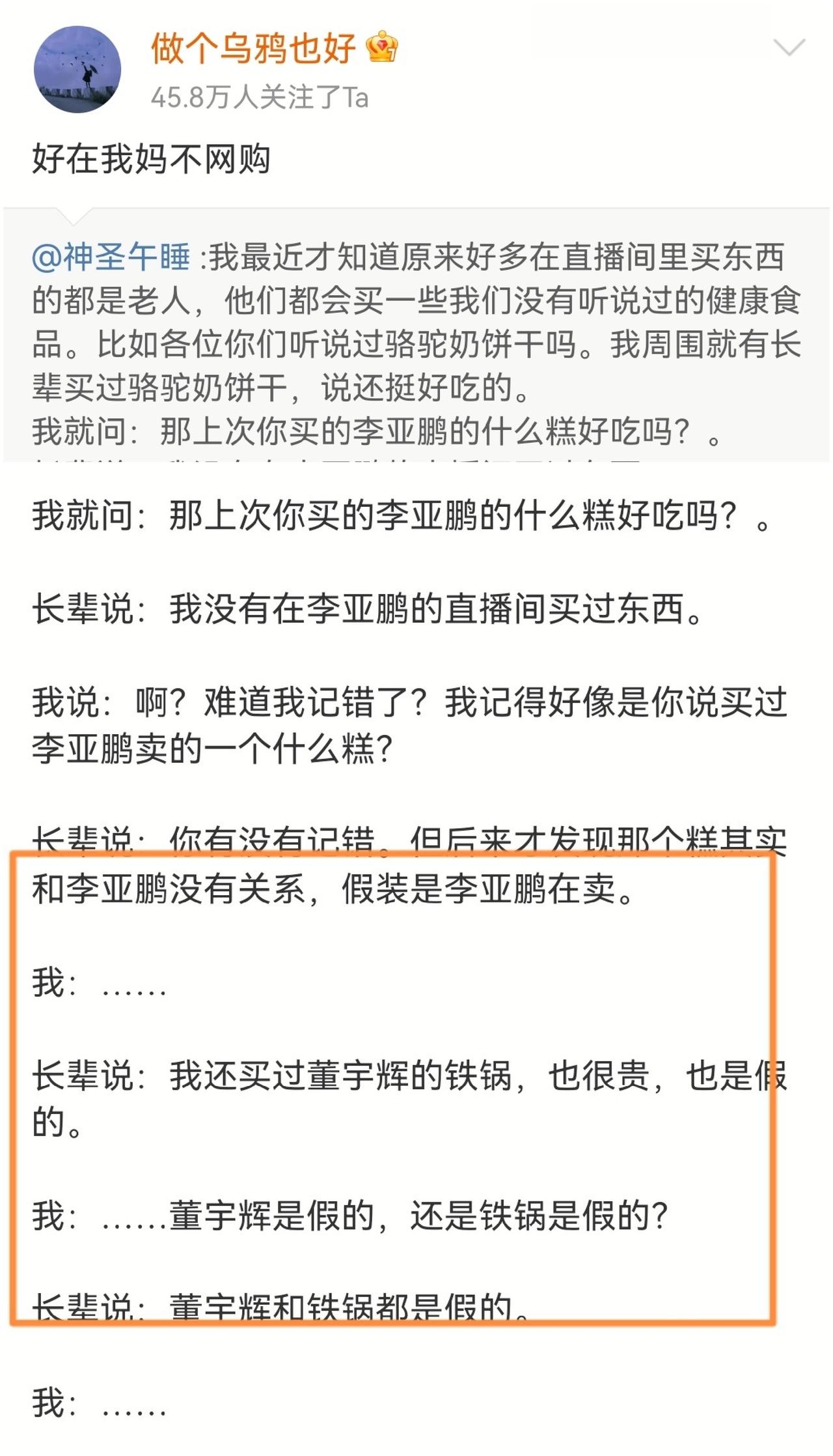 “董宇辉和铁锅都是假的!” 看到网红作家木子美转发的内容,才知道部分老年人对网络信息的辨别能力有多令人担忧。 有个网民讲述他老妈的网购经历,声称竟然被假的“李亚鹏”和“董宇辉”给欺骗了。 这个说法我觉得完全有可能,我个人就经常刷到一些直播间,无论直播间的布局风格还是直播间的名称都跟董宇辉的直播间高度相似。什么“与光同行”,什么“与惠同行”诸如此类的。直播间也是色调纯白,桌台物品摆放、标语等等也全都是模仿与辉同行。 有些老年人可能对与辉同行的其它主播不太熟悉,那么就可能会被误导。 所以,归根到底,还是平台的错,竟然允许这种赤裸裸的抄袭行为发生和存在,这真的很违背常理!