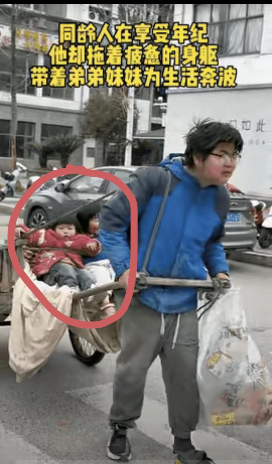 这孩子才多大啊,肩膀上就硬生生扛起了一个家。 爸妈都没了,为了不让两个妹妹流浪街头,他只能含泪辍学。 那辆破板车就是一家人的命,上面睡着不懂事的妹妹,下面堆着卖命换钱的红薯。 看着他一次次把红薯递过去,又一次次被人冷脸拒绝,我是真不敢看。 可他没法停,停了今天仨人就得饿肚子。 摸着妹妹的脸,这小家伙心里竟然想的是:哪怕这辈子打光棍,也要把妹妹养大。 所谓的“长兄如父”,在这一刻具象化了。 生活这把刀,真是不长眼,专挑苦命人下手。 这一车的重量,压弯了少年的腰,却也逼出了最硬的脊梁。