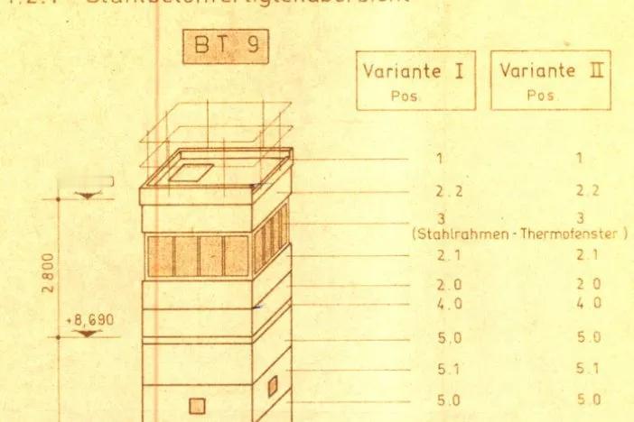 冷战时期,东德边防部队开始在柏林墙上建造新的观察塔,这些观察塔不再是圆形的,而是由方形预制的混凝土构件建成。抗风能力更强。哨所瞭望塔