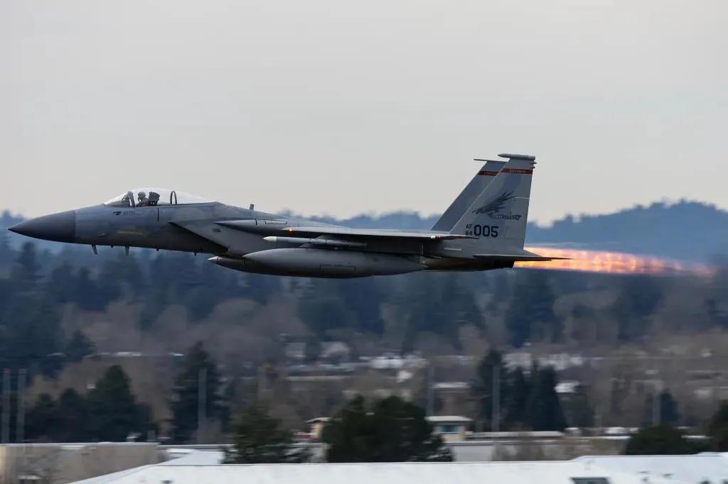 美空军波特兰国民警卫队基地,第142战斗机联队/第123战斗机中队的F15EX开启加力,奋力垂直攀升。其发出的巨大轰鸣声,震得候机楼的玻璃哗哗作响。