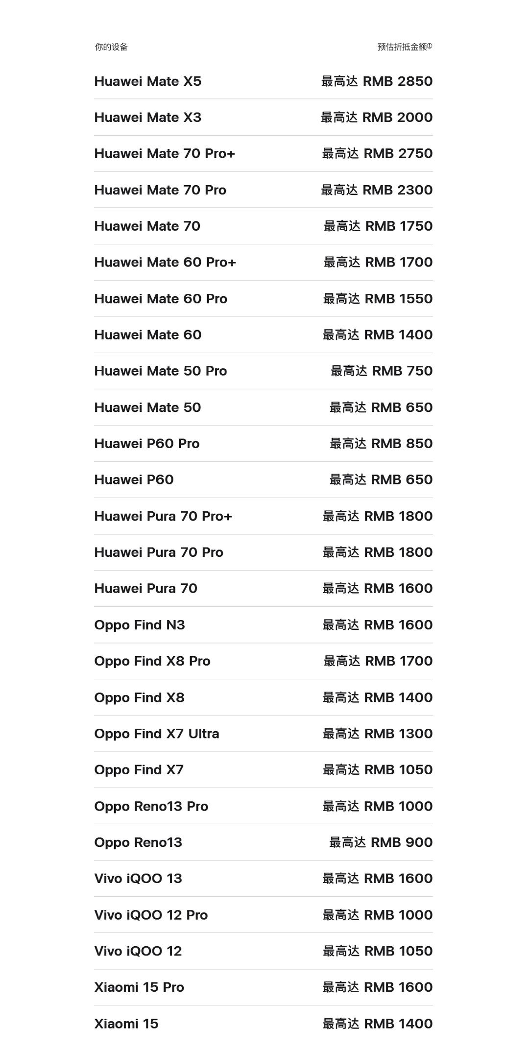 苹果这次有点意思。官网悄咪咪更新“以旧换新”,居然把华为、小米、OV都纳进来了。 华为Mate 70 Pro+最高能抵2750,虽然比不上自家iPhone 16 Pro Max的5800,但这动作本身,就挺耐人寻味。 说白了,市场压力摆在眼前。去年华为强势回归,抢了不少高端份额,苹果这招,像是主动放下身段,想从安卓用户里“挖”人。 对你我来说,手里旧的安卓机多了一个变现渠道,算是件方便事。 但我觉得,这更像是一个信号:那个高高在上的苹果,也在学着更接地气了。在竞争白热化的市场里,没有谁还能一直端着。 这对消费者终归是好事,选择多了,实惠也可能多了。你看好这个新变化吗?