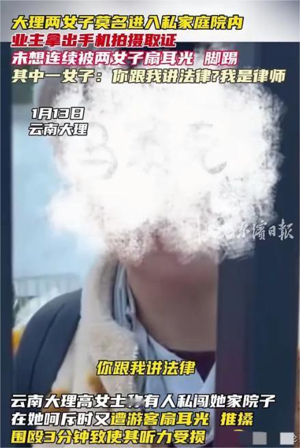 云南大理,两名女子去游玩,路过一家私人院子,看到里面很漂亮,就跑了进去,吓到了业主,业主拿出手机拍摄取证,不料被两名女子扇耳光,还被脚踢,业主足足被围殴了3分钟,业主跟她们讲法律,一个女子扬言道:你跟我讲法律,我是律师,我怕你跟我讲法律吗?   “我们敲了半小时门都没人应,你有没有礼貌!”说着,女子扬起手就是一巴掌,狠狠扇在了这间院子主人的脸上。   挨打的是院子的业主高女士,而动手的则是两名强行闯入她家的陌生女子!   这荒唐的一幕发生在2025年11月30日的云南大理。当天下午,高女士看到两个陌生人进了她家的院子,就上前劝阻:“这是我家,请你们出去。”   然而,高女士的好言相劝不但没有得到对方的道歉,反而是其中一人理直气壮地回怼:“我们就是想进来参观一下,你为什么一直不开门!”   面对陌生人的无理取闹,高女士一再解释:这里是她的私人住宅,有大门、密码锁、有围栏,并非景区,也不是开放空间,她没有义务让游客参观。说话间,高女士拿出手机录像,想着留下证据以备不时之需。   就在此时,离谱的一幕发生了:对方直接先发制人,扇了高女士一耳光,随后另一人也加入进来,对高女士又踢又踹,还吐口水。就这样,高女士被整整围殴了三分钟。   期间,高女士搬出法律警告,却被一名女子趾高气扬地回呛:“你跟我讲法律?我是律师,我怕你跟我讲法律吗?”   事后,高女士紧急到医院检查,结果右耳听力严重受损。高女士报警的同时,也把这件事发到网上,没想到瞬间引爆舆论。   网友们的反应几乎一边倒:擅闯民宅就是底线,小孩子都懂的道理,一个律师能不懂?   然而更让大家窝火的是,事发后,这两人不但不道歉,还在高女士家门口晾脏衣服、频繁举报她的车,甚至谎报她“非法集会”,严重影响了高女士的正常生活。   如今,高女士还在等一个公正的结果,这个结果不仅关乎受害者能否获得慰藉,更关乎所有人对“安全”与“公平”的信心。   对此你有什么看法?欢迎在评论区留言讨论。擅闯民宅 法律   信息来源: 哈尔滨日报2026-1-13|云南大理两女子莫名闯入私家庭院内,业主拿出手机拍摄取证反遭殴打 文|墨海 编辑|史叔