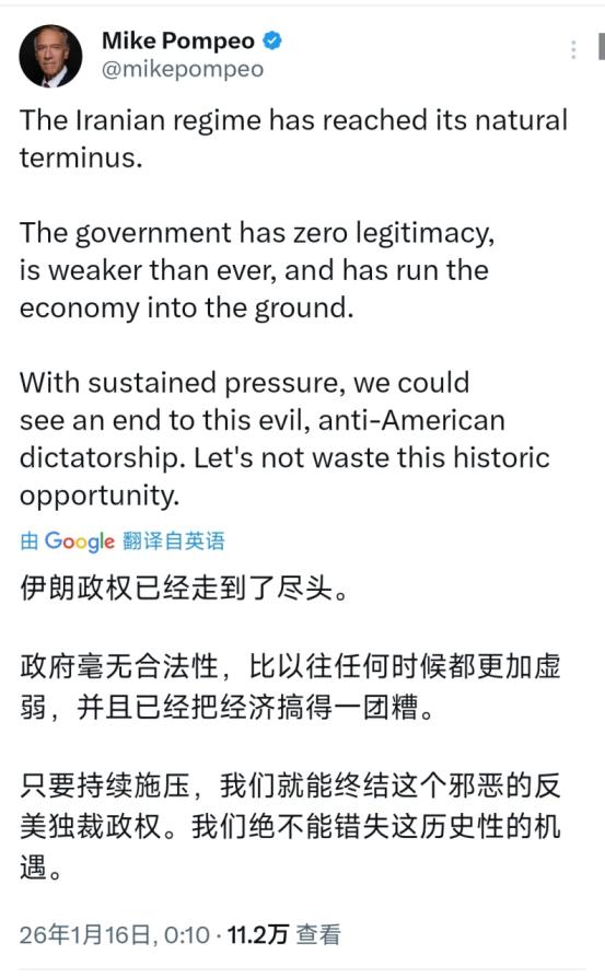 瘦到脱相的美国前国务卿蓬佩奥北京时间1月16日发文写道:“伊朗政权已经走到了尽头。政府毫无合法性,比以往任何时候都更加虚弱,并且已经把经济搞得一团糟。只要持续施压,我们就能终结这个邪恶的反美独裁政权。我们绝不能错失这历史性的机遇。” 这番话说白了就是过气政客不甘心被人忘了,拿国际局势当戏台子煽风点火。更可笑的是,他这调子激进得离谱,和特朗普那边的真实盘算差得老远,这种割裂感刺眼又滑稽。 谁都清楚蓬佩奥是个什么人。他当年当国务卿的时候,就敢把“我们撒谎,我们欺骗,我们偷窃”挂在嘴边,还被称作“历史上最差国务卿”。 卸任之后没了权势靠山,美国政商界都忙着和他划清界限,连特朗普都明说不打算请他进新政府。他只能靠窜台捞钱、说些极端话刷存在感,如今瘦得脱了形,估计是日子过得不顺心。 想靠拿伊朗说事博眼球,既想显露出自己还有分量,说不定还想给背后势力递投名状,可这点小心思,早就被国际社会看得透透的。 他在文章里把伊朗政权说得一文不值,说人家“走到尽头、毫无合法性、经济一团糟”,这纯属睁着眼睛说瞎话。伊朗现在确实面临抗议活动,经济也挺困难。 2025年6月的“十二日战争”,打坏了它的核设施、炼油厂这些经济命脉,再加上美国长期制裁,里亚尔汇率跌得厉害,通胀也失控了,老百姓的生活成本一个劲往上涨。 这些都是实打实的情况,但绝不意味着伊朗政权就快崩溃了。伊朗最高领袖哈梅内伊有着绝对权威,伊斯兰革命卫队建制完整,掌控力也强。面对抗议,他们采取了“分化管控”的办法,既打击武装骚乱的人,又出台必需品补贴政策安抚老百姓。 那短短十二天的抗议,连个统一的组织领导都没有,根本动不了神权体制的根基。蓬佩奥故意把局势夸大,不过是为自己的激进言论找个借口罢了。 更打脸的是,蓬佩奥喊着要“持续施压终结政权”,特朗普那边的心思却早就变了。现在美国对伊朗,压根没想搞政权更迭,只是在“施压”和“克制”之间反复掂量。 特朗普一边放话有“强硬选项”,一边又在找机会搞外交谈判,白宫也明确说了,外交才是首选方案。五角大楼给出的军事选项,也多是网络攻击、定点打击这类有限度的行动,根本没打算陷进中东战争的泥潭里。 要知道美国内部派系早就吵翻了,MAGA阵营坚决反对介入伊朗内乱,还指责鹰派想挑动战争。特朗普本身更看重国内的事和选举利益,他怎么可能跟着蓬佩奥这个过气的人走,去冒局势失控的风险。 蓬佩奥大概是忘了,自己早就不是能左右美国外交的国务卿了,还沉浸在过去随便指手画脚的幻觉里。他当年就爱搞这套极限施压的把戏,比如宣布以色列定居点不违反国际法,公然违背联合国决议和国际共识,最后招来全世界的批评。 现在他又想故技重施,可问题是他如今既没有美国政府撑腰,也得不到国际社会的认可,连特朗普都懒得搭理他。他这番叫嚣,除了让自己多上几条无关紧要的新闻,根本起不了任何作用。 伊朗军方早就放话了,会团结起来挫败敌人的阴谋,哈梅内伊更是直接敦促特朗普,管好自己国家的事就行。显然没人把蓬佩奥的疯言疯语当回事。 说到底,蓬佩奥这番操作,本质就是一场自我感动的表演。他心里清楚,自己在主流政治圈已经站不住脚了,只能靠贩卖极端反伊叙事博眼球、谋私利,把伊朗当成自己刷存在感的工具。 他和特朗普之间的策略割裂,更能显出他的尴尬处境。特朗普是在为美国的中东利益精打细算,就算态度强硬,也带着务实的考量。可蓬佩奥只在乎自己能不能被人看见,根本不管自己的话符不符合实际,也不管跟美国当下的战略合不合拍。 伊朗的局势又复杂又严峻,是经济困局和地缘博弈等多重因素缠在一起造成的,绝不是蓬佩奥一句“持续施压”就能改变的。这个靠撒谎欺骗上位的过气政客,再怎么歇斯底里地叫嚣,也不过是跳梁小丑式的自娱自乐。 等这波热度过去,他只会被人忘得更快。毕竟国际政治舞台,从来不是过气之人煽风点火的地方,实力和格局才是立足的根本。而这两样东西,蓬佩奥早就一无所有了。