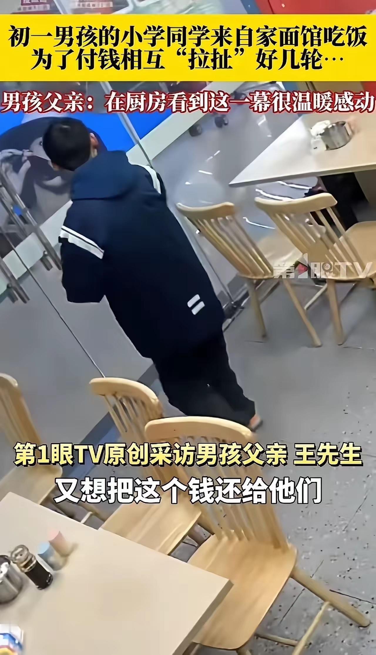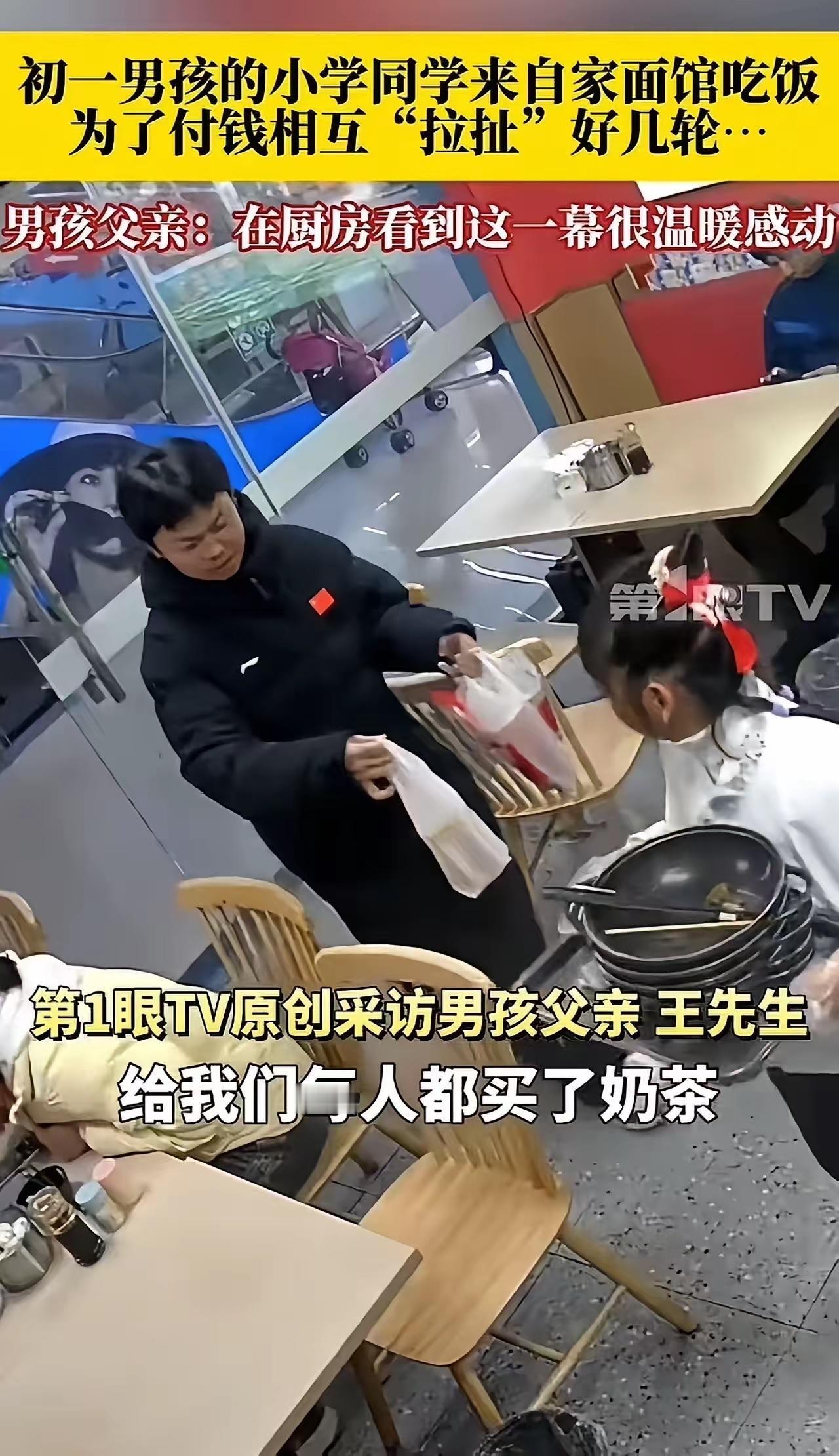 几个初中男生,给全网上了一堂“人品课”!初一男孩的小学同学们,来自家面馆吃饭,为了付钱,相互“拉扯”好几轮!让人看着看着就泪目了!网友:什么是兄弟?兄弟是相互托举,而不是占便宜! 事情发生在一家普普通通的社区面馆里,老板的儿子刚上初一,周末的时候,几个小学时的死党约着来店里吃面,谁也没想到,一顿简单的午饭,最后会因为付钱的事,上演了好几轮让人泪目的“拉扯大战”。 那天下午,五个半大的小子背着书包,说说笑笑地走进了面馆,一进门就喊着要找老板的儿子。 老板看着这群眼熟的孩子,都是儿子从小一起长大的好朋友,心里挺高兴,连忙招呼他们坐下。 孩子们也不客气,凑在一起点了四碗牛肉面,还特意叮嘱不要放香菜。 老板在厨房忙活的时候,特意多煮了一碗,想着孩子们正是长身体的时候,而且都是自家孩子的好朋友,就打算这顿饭自己请了,让孩子们吃得尽兴。 面端上桌后,五个男孩围坐在一起,边吃边聊小学时的趣事,时不时发出爽朗的笑声,整个面馆都热闹了起来。 老板看着他们亲密无间的样子,想起儿子平时念叨着想念老同学,心里也跟着暖暖的。 可没等孩子们吃完,其中一个穿蓝色外套的男孩就悄悄摸出了口袋里的零花钱,攥在手里等着结账,其他几个孩子也察觉到了,纷纷开始掏书包找钱包,一场无声的“较量”就此拉开序幕。 最先吃完的男孩放下筷子,起身就往收银台跑,还没等他站稳,另一个戴眼镜的男孩就追了上来。 一把拉住他的胳膊:“我来我来,上次就是你请的!”被拉住的男孩不肯松手,两个人就这样在收银台旁推来推去,脸上带着孩子气的倔强。 剩下的三个孩子也赶紧放下碗围了过来,有的往老板手里塞现金,有的拿出手机想扫码支付,你一言我一语地争着要买单。 “我带的钱够,听我的!”“不行,这家店是他爸开的,你让他请客像话吗?”“要不我们AA,谁也别争了!” 几个孩子各执一词,手里的钱和手机被推来推去,有几张零钱不小心掉在了地上,他们也顾不上捡,只顾着把付钱的“机会”让给对方。 老板站在一旁,看着孩子们涨红了脸相互拉扯的样子,既想上前劝架,又被这份纯粹的情谊打动得说不出话来。 老板的儿子看着同学们这么较真,心里有点过意不去,悄悄从柜台里拿了五瓶牛奶,塞到每个同学手里,想让他们别再争了。 可孩子们接过牛奶后,还是没放弃买单的念头,最后穿蓝色外套的男孩趁大家不注意,把一张五十块钱放在了收银台上,拉着同学们就往外跑。 老板赶紧拿起钱追出去,可孩子们已经跑远了,还回头喊着:“老板叔叔,钱不够我们下次补!” 本以为事情到这里就结束了,没想到半个多小时后,这五个男孩又气喘吁吁地跑了回来,手里还提着五杯奶茶。 不由分说地塞进老板和他儿子手里:“叔叔,这是我们请你喝的!”“你家面太好吃了,下次我们还来!”说完又一溜烟跑走了,留下老板愣在原地,手里捧着还带着温度的奶茶,心里涌上一股暖流。 这段孩子们抢着付钱的监控视频被老板发到网上后,很快就火了,网友们纷纷留言点赞。 有人说:“这才是兄弟该有的样子,相互托举,而不是想着占便宜”;还有人感慨:“现在很多成年人聚餐都想着怎么逃单,没想到被几个初中生上了一课”。 更有人回忆起自己的年少时光:“想起小时候和好朋友抢着买单的样子,那时候的情谊真的太纯粹了”。 其实这几个孩子的家境都很普通,手里的零花钱也都是攒了很久的,可他们宁愿自己少花点,也不想让朋友吃亏。 他们不懂什么复杂的人情世故,只知道朋友之间就该互相惦记、互相体谅。 老板后来在采访中说,自己开店这么多年,见过太多为了付钱争得面红耳赤的成年人,却第一次被几个孩子的举动打动到眼眶发热。 这碗充满烟火气的面条,这场孩子气的“付款拉锯战”,让我们看到了少年们最珍贵的品质。 在这个越来越讲究利益交换的时代,这样不掺任何杂质的友谊,显得格外难得。 它告诉我们,最好的关系从来不是单方面的付出,而是你想着我,我惦记着你,彼此真诚相待,互相体谅包容。 这几个初中男生用最朴素的行动,诠释了什么是真正的兄弟情谊,也给全网送上了一堂最暖心的人品课。
