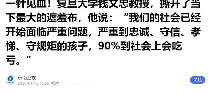 复旦大学钱文忠教授,撕开了中国社会当下最大的遮羞布,振聋发聩!他说:“我们的社会已经开始面临严重问题,严重到忠诚、守信、孝悌、守规矩的孩子,90%到社会上会吃亏。”字字诛心,发人深省! 先把话放在最前面:钱文忠这句话之所以刺耳,是因为它戳中了很多家庭的“默认设定”,我们一直以为把孩子教得忠诚、守信、孝顺、守规矩,就等于给他铺好了路,可他提醒的是另一件事,在当下的社会环境里,这些品质如果只有“软的一面”,没有“自我保护”和“边界感”,十有八九会被人当成好欺负。 生活里这样的场景随处可见,戳中了无数人的亲身经历。职场上,熬夜打磨方案的老实人,成果被同事轻松窃取却不好意思揭穿;朋友借钱时拍着胸脯保证按时归还,真到要账时,借钱的反而成了“小气鬼”,不少人碍于情面只能不了了之。 民政部的数据显示,全国独居青年已突破9200万,其中37%的人坦言曾因太老实被欺负到想逃离社交。 家庭场景中这种困境更显无奈。逢年过节的家庭聚会上,不少年轻人会被亲戚围着追问薪资、婚恋,明明心里抵触,却因为怕被说“不孝”“不懂事”而默默忍受;有些父母习惯性用“为你好”捆绑孩子的人生选择,让恪守孝悌的孩子在自我追求与家庭期待间反复内耗。 北京大学家庭研究院的报告显示,35%的Z世代因为受不了亲戚的情感绑架,直接屏蔽了家族群。这些案例都在印证,没有边界感的忠诚与孝顺,最终只会变成束缚自己的枷锁。 很多人误以为钱文忠教授是在否定传统美德,其实恰恰相反,他是在提醒我们跳出对美德的片面理解。 就像他曾指出的,我们对很多国学经典存在断章取义的误解,比如“以德报怨”,孔子本意并非让人做受气包,而是强调“以直报怨,以德报德”,用公正的态度对待伤害,用善意回报善意。 这恰恰说明,传统美德从来不是让人忍气吞声,而是暗含着刚柔并济的智慧,只是我们在教育中往往只传递了“柔软”的一面,忽略了“坚定”的底色。 问题的核心从来不是忠诚、守信这些品质过时了,而是在复杂的社会环境中,纯粹的“软美德”缺乏自我保护的能力。 当下社会部分人在利益驱动下轻视诚信,制假售假、商业欺诈等行为时有发生,这让坚守底线的人反而陷入被动。但这并不意味着我们要放弃美德,而是要给美德装上“铠甲”——边界感就是最好的铠甲。 我们教孩子忠诚,是让他对值得的人真诚,而非不分对象地付出;教他守信,是坚守自己的承诺,而非被他人的要求绑架;教他孝悌,是懂得感恩陪伴,而非无底线地妥协;教他守规矩,是敬畏规则底线,而非盲目顺从不合理的安排。 钱文忠教授的话之所以振聋发聩,就是因为他点破了家庭教育的盲区——只教美德不教边界,本质上是在把孩子推向“吃亏”的困境。 当下社会正在不断完善信用体系,李克强总理曾强调要“让失信者寸步难行”,随着制度的健全,守信者终将获得更多保障。 但在这之前,我们更要教会孩子,美德是内在的底色,边界感是外在的防线。真正的优秀,从来不是做一个无底线的老好人,而是既能心怀善意、坚守底线,又能果断拒绝、保护自己。 这样的孩子,才能在复杂的社会中站稳脚跟,既不违背本心,也不被现实裹挟,这才是对传统美德最恰当的传承,也是我们对孩子最实在的保护。