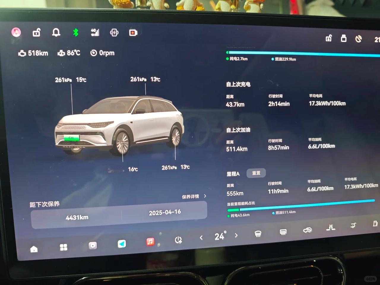 C11能耗给个好评 跑了一趟长途,刚好留意了下天气冷了之后C11的续航表现,从上海到安徽,出发前加满了油,电充到百分之九十,表显续航975km,全程燃油优先模式一共行驶555km,表显续航677km,平均油耗6.6升,平均电耗17.3,我们一共三个成年人,还带了一只猫,后备箱装满东西,续航总体还可以,燃油优先模式可以保电,电池里程会一直保持在182km上下。虽然知道天气冷能耗会高很多,但因为是增程,空调和加热还可以随心所欲开,堵车心里也没有慌,而且开暖风的时候油耗电耗都没上升,应该是暖风用了增程器的热量。总体来说这趟高速开下来,是要给C11好评的,真的没有续航焦虑。【来自懂车帝车友圈】
