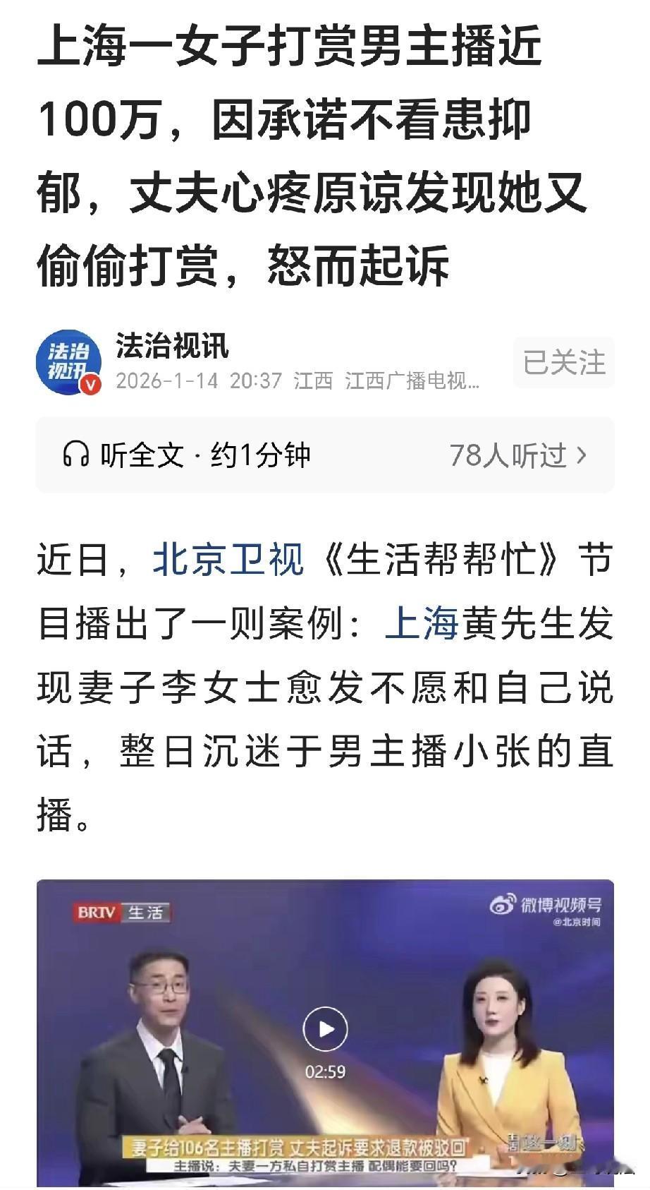 天都塌了!上海,一男子结婚10年,他突然发现,家里几十万存款不见了,他追问之下,妻子承认,几十万存款被她打赏给男主播了,妻子承诺,以后再也不看直播,不料,妻子因此抑郁了,男子心疼,原谅了妻子,之后他又发现,妻子屡教不改,继续给男主播打赏,累计金额近百万元,还用V信给男主播转账,男子忍无可忍,将男主播告到法院,要求返还97万元,法院判了! 黄先生辛辛苦苦,在外工作,他挣来得钱,如数交给了妻子生活。 他们的小家,虽然算不上大富大贵,但是经过他的奋斗,没有欠款,还有一笔不小的存款。 可是他最近发现,他回到家里,妻子李某对他爱理不搭,十分的冷淡。 黄先生心里难过,他不知道自己哪里做错,也不知道究竟发生了什么。 一个偶然的机会,他发现了家里有几张借条,黄先生纳闷,自己家有存款,压根没必要问别人借钱。 他追问妻子,这借条是怎么回事?妻子敷衍了事,说借条是给亲戚打的,因为她临时用钱,这才向亲戚借钱周转。 黄先生不相信这话,家里明明有几十万存款,你不用家里的钱,干嘛非要向别人借钱? 李某支支吾吾,家里的确是有存款,她看瞒不住了,只有把实话说了出来。 原来,她把几十万存款全部打赏给了男主播了,她没有钱用,因此才向亲戚借钱。 黄先生一听,天都塌了,那几十万存款,是自己辛辛苦苦才挣来的,那是家庭的基石,是家人孩子,最后的保证。 李某看丈夫生气,她自知理亏,连忙向黄先生做出了承诺,以后再也不看直播。 黄先生看她道歉,表示自己要平静平静,他照常上班下班,并没有追究下去。 可是自此之后,黄先生心里有了隔阂,自己在外拼命工作,挣来的钱却都顺着妻子流向了男主播。 黄先生越想越气,自己又是何苦来着? 可是不久之后,黄先生又发现,妻子李某的确是不看直播了,但是,李某的情绪越发的低落。 不久之后,黄先生发现,妻子抑郁了,她面无表情,生无可恋的模样。 黄先生心想,罢了,毕竟俩人夫妻一场,妻子犯错,也许是自己工作太忙,陪伴的时间有点少了。 黄先生这样一想,顿时觉得心疼妻子,他想通了,选择了原谅。 之后,日子又恢复到来了原来的模样,一切似乎从来没有发生过。 可是,黄先生没有想到,李某的心思早就不在他的身上。 李某继续打赏,黄先生挣回来的钱,被她打赏的一干二净,她和男主播小张,一直都有不断的联系。 黄先生原本以为,只要自己选择了原谅,李某改过自新,自己的家庭依旧和过去一样。 可是他不知道,他的原谅,并没有被妻子珍惜,妻子反而觉得,他就是个好欺负的男人。 不久之后,黄先生赫然发现,妻子依旧还在继续打赏,他大概一算,打赏的金额已经接近了百万元! 黄先生痛心疾首,那一百万,全部都是自己的血汗,他对妻子从不设防,他体谅妻子,在他心里,俩人是结发夫妻,这钱原本就有妻子的一半。 可没想到,自己的苦心被妻子践踏,金钱的损失倒还其次,妻子的背叛,才让他痛的锥心凉。 黄先生一气之下,将男主播小张告上 了法院,要求返还他们夫妻共同财产97万。 法院经过调查,真相大白,黄先生更加的崩溃了。 原来,妻子和男主播小张,早在一年之前,就建立了私下的联系。 他们加上了V信,聊天内容不忍直视。 这就是说,他们早已逾越了该有的限度,只有黄先生被傻傻的蒙在鼓里。 李某除了给小张打赏,还在V信里给小张转账。 因此法院认为,李某和男主播小张之间,存在不该发生的故事。 而李某给小张打赏,实际是为了维持和小张的交往,属于赠与行为。 而李某打赏给小张的款项,属于黄先生和李某夫妻共同财产。 《民法典》第1062条规定,夫妻在婚姻关系存续期间所得的工资、奖金、劳务报酬等财产,为夫妻的共同财产,归夫妻共同所有;夫妻对共同财产,有平等的处理权。 黄先生和李某婚内所有存款,属于夫妻共同财产,并非李某个人财产。 夫妻共同财产是不可分割的整体,需要双方协商一致方可处分大额财产。 李某未经黄先生同意,擅自将近百万共同财产用于打赏,侵害到了黄先生的财产权益。 《民法典》第153条第2款规定,违背公序良俗的民事法律行为无效。 李某与男主播小张之间存在长期不正当的交往,李某给小张的打赏,是为维系他们之间的不正当交往。 该行为违背夫妻忠实义务,违背公序良俗。 此类赠与并非正常消费,而是以不正当关系为目的的财产转移。 李某的行为,既损害了婚姻家庭的稳定,也违背了公序良俗,因此法院认为,赠与无效。 法院经过核算,扣除平台分成税费,男主播实际收益为28万元。 再加上李某在V信上给小张的转账金额,法院判决,男主播小张应返还黄先生30万元。 之后,黄先生选择了离婚,结束了他和李某10年的婚姻。 对此,你怎么看?