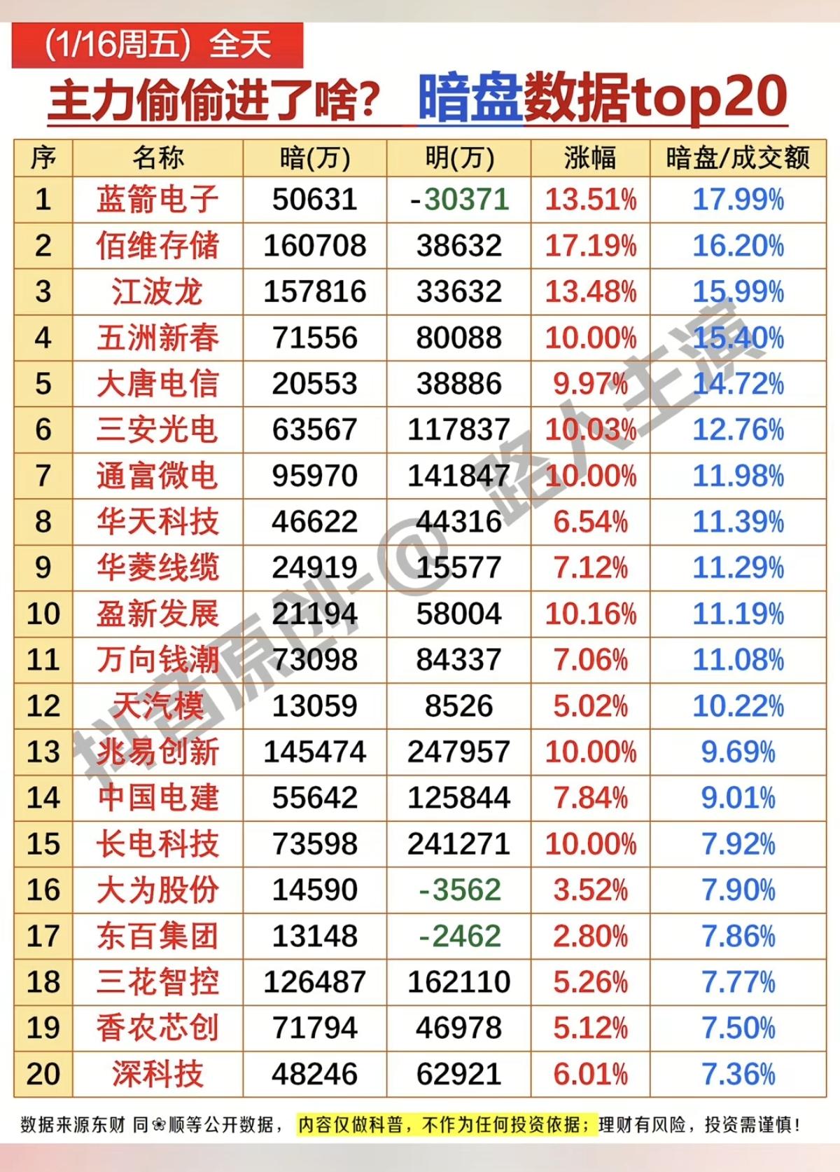 1.16周五 暗盘资金买入,抢筹个股榜! 资金抢筹、出逃方向: 超临界发电,电源设备,光通信模块,人形机器人,稀土永磁,工程机械icon概念等资金抢筹明显 智能体AI应用,信创,人脑工程,中药,网络安全等板块资金疯狂出逃