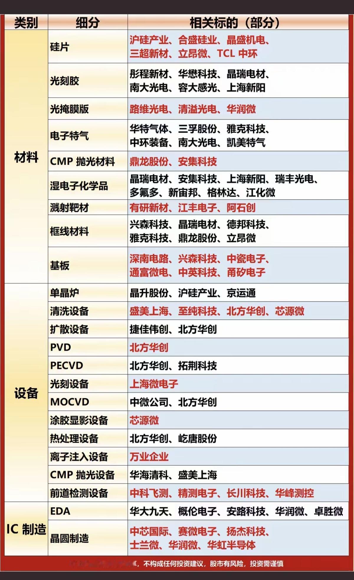 国产半导体:全景梳理!深度解析 1.芯片种类:(存储,模拟,逻辑) 2.芯片设计:CPU/GPU,传感器等 3.芯片材料:硅片,靶材等 4.芯片设备:光刻机,胶影,清洗等 5.IC制造