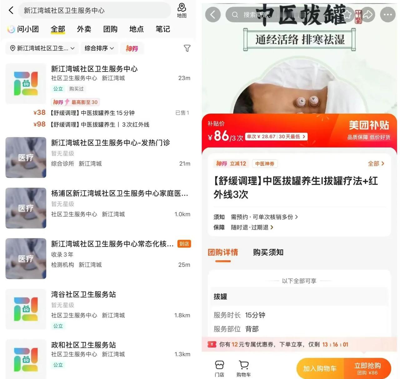新江湾城社区卫生服务中心率先入驻美团平台,成为全市首个上线主流生活服务平台的社区卫生机构。其提供中医理疗、上门换药及管路维护等居家健康服务,由在职医护规范操作且执行政府定价。此举依托“互联网+医疗健康”政策,旨在通过数字化手段拓展服务渠道、优化流程,为辖区居民提供更便捷、优质、可及的健康管理体验。