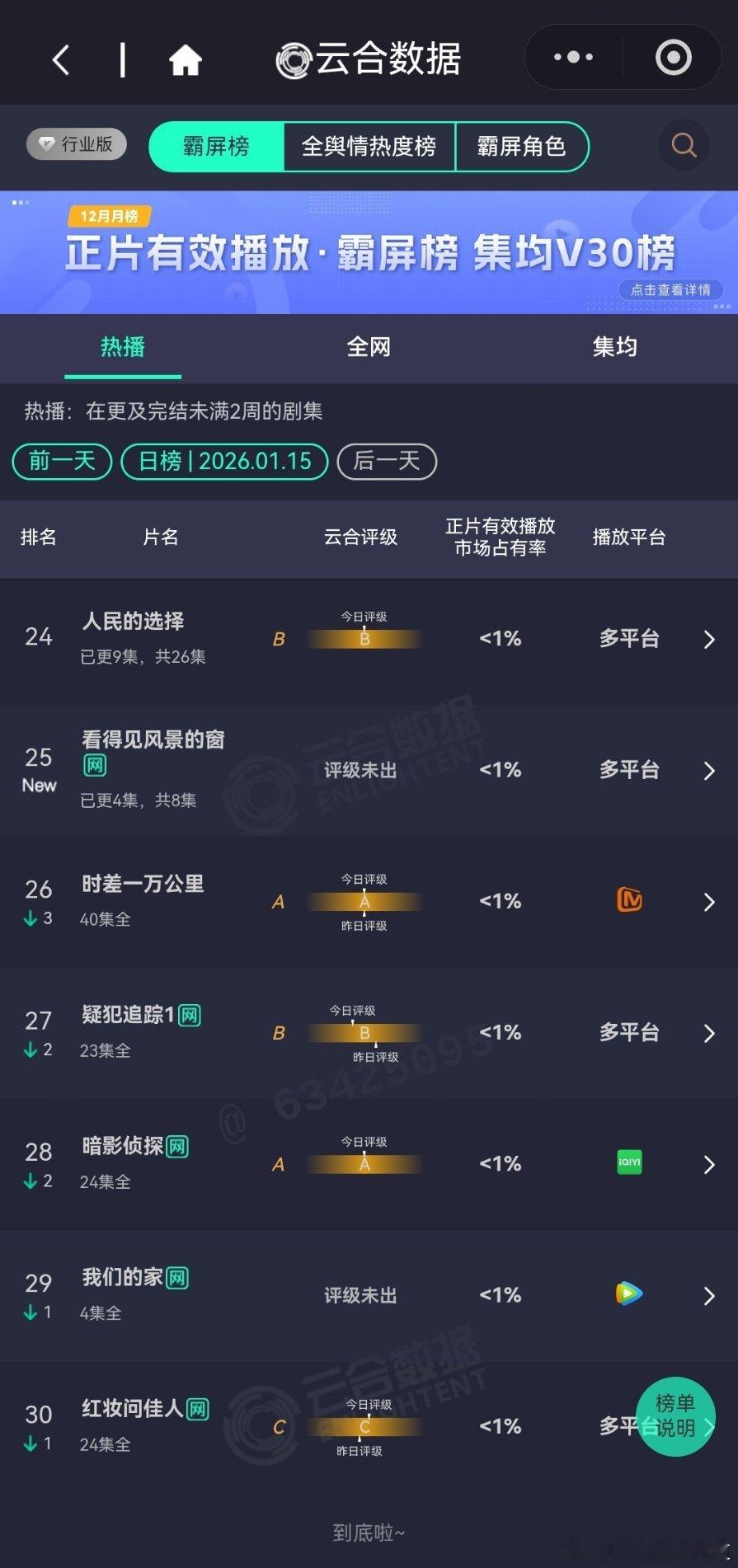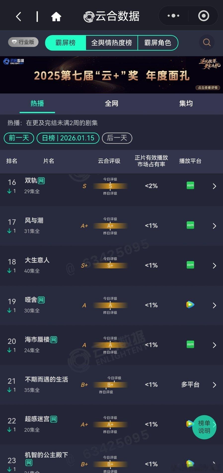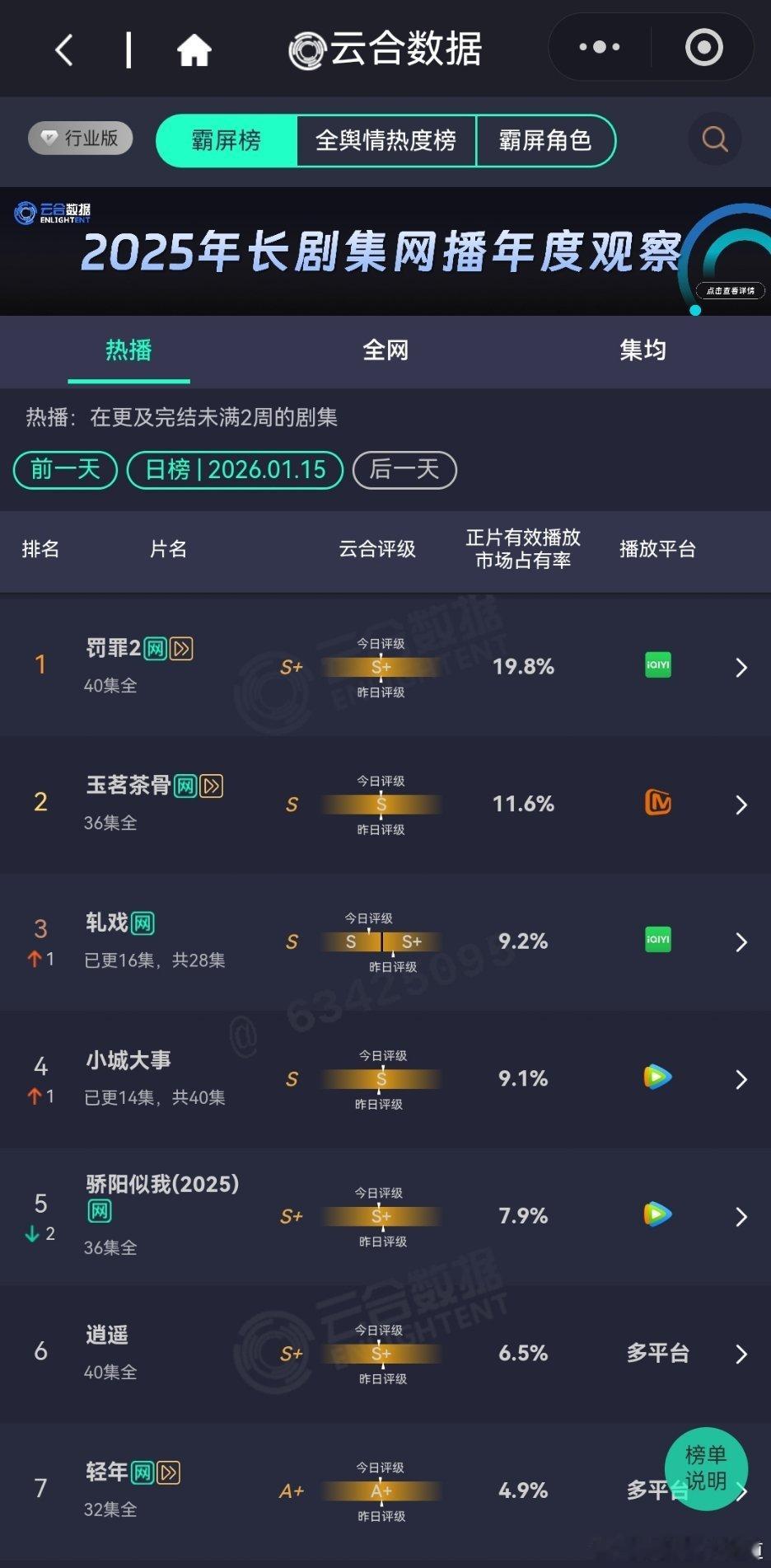 1月15日云合播放占比云合 罚罪2 19.8%大家应该都没想到它能霸榜这么久玉茗茶骨11.6%看这情况,保住S就不错了,难怪于正要发疯。轧戏9.2%S+只保持了一天?小城大事9.1%扑开扑走御赐小仵作2 2%平开,看看明天后天翻倍情况再说。