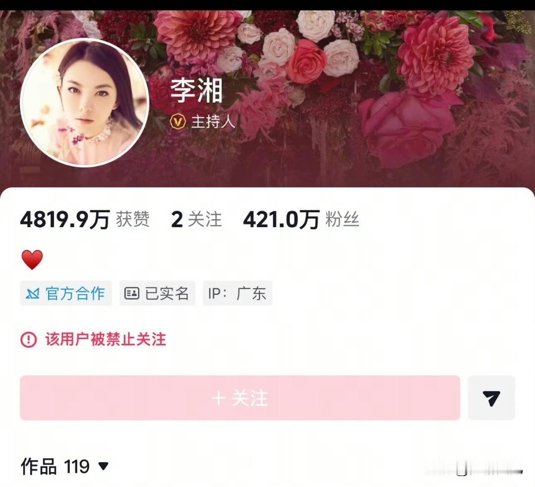 李湘为什么突然被悄无声息的被全网禁止关注了? 今天娱乐最重磅新闻:李湘全平台账号被禁止关注。 李湘这几年出来的新闻不多啊,至多也就是时不时带着女儿炫下富,炫了那么久,也没见出啥问题,怎么突然一下子就被全网禁止关注了? 而能做到悄无声息的突然性的全平台禁止关注,那么只可能是一种声音,来自上面的决定。 结合最近的国内重磅新闻,好像只有携程被反垄断调查,据此一些好事的网友猜测可能与此事有关!当然这都是捕风捉影毫无根据的事,不能瞎猜测,乱生谣言! 至于为何被禁,个人感觉就是此事很突兀,而老话说的事出反常必有妖,当然事情真相如何还需要等等看。如果单纯只是炫富,其实问题就不会大!